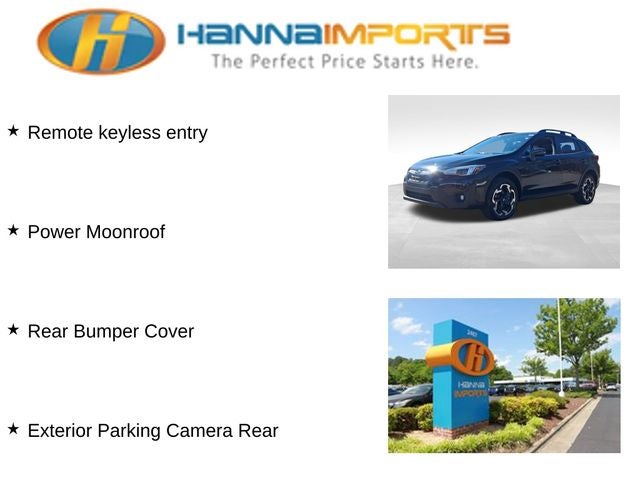Why shop with Hanna Imports? We specialize in hand-selecting top-quality used cars, trucks, and SUVs for drivers across Raleigh, Durham, Cary, Chapel Hill, and the greater Triangle area of North Carolina. Our massive selection of 1,000+ vehicles on our Raleigh lot is carefully curated to include the most sought-after models, all priced below market value. We believe in transparency and efficiency—our vehicles are aggressively priced from the start, which means no haggling, no hassle, and no wasted time. The price you see is our absolute best price. Whether you're coming from Wake Forest, Apex, Garner, or anywhere in central NC, we’re committed to making your car-buying experience smooth, affordable, and enjoyable. Come see why Hanna Imports is one of the most trusted used car dealerships in North Carolina! Used Subaru Crosstrek in Raleigh. Used Subaru Crosstrek in North Carolina, Moonroof & Navigation & harman/kardon Audio (Power Moonroof, Radio: Subaru STARLINK 8.0 Multimedia Nav System, and harman/kardon Speaker System), Crosstrek Limited, Exterior Parking Camera Rear, Rear Bumper Cover, Remote keyless entry, 3.70 Axle Ratio, 4-Wheel Disc Brakes, 6 Speakers, ABS brakes, Air Conditioning, All-Weather Floor Liners, Alloy wheels, AM/FM radio: SiriusXM, Anti-whiplash front head restraints, Auto High-beam Headlights, Auto-Dimming Exterior Mirror w/Approach Light, Auto-Dimming Mirror w/Compass & HomeLink, Automatic temperature control, Brake assist, Bumpers: body-color, Cargo Net, CD player, Driver door bin, Driver vanity mirror, Dual front impact airbags, Dual front side impact airbags, Electronic Stability Control, Emergency communication system: STARLINK Safety and Security (Subscription Required), Footwell Illumination Kit, Four wheel independent suspension, Front anti-roll bar, Front Bucket Seats, Front Center Armrest, Front fog lights, Front reading lights, Fully automatic headlights, Heated door mirrors, Heated Front Bucket Seats, Heated front seats, Illuminated entry, Knee airbag, Leather-Trimmed Upholstery, Low tire pressure warning, Occupant sensing airbag, Outside temperature display, Overhead airbag, Overhead console, Panic alarm, Passenger door bin, Passenger vanity mirror, Power door mirrors, Power driver seat, Power steering, Power windows, Radio data system, Radio: Subaru STARLINK 8.0 Multimedia Plus System, Rear anti-roll bar, Rear seat center armrest, Rear window defroster, Rear window wiper, Security system, Speed control, Speed-sensing steering, Split folding rear seat, Spoiler, STARLINK/Apple CarPlay/Android Auto, Steering wheel mounted audio controls, Tachometer, Telescoping steering wheel, Tilt steering wheel, Traction control, Trip computer, Turn signal indicator mirrors, Variably intermittent wipers, and Wheels: 18 x 7.0J Alum Alloy Blk w/Machine Finish.