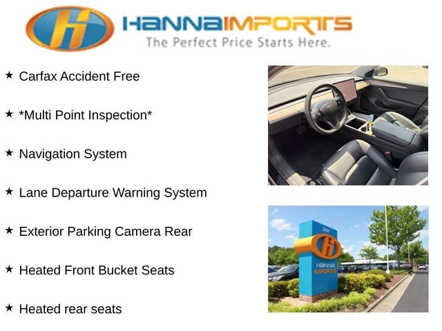 Why shop with Hanna Imports? We specialize in hand-selecting top-quality used cars, trucks, and SUVs for drivers across Raleigh, Durham, Cary, Chapel Hill, and the greater Triangle area of North Carolina. Our massive selection of 1,000+ vehicles on our Raleigh lot is carefully curated to include the most sought-after models, all priced below market value. We believe in transparency and efficiency—our vehicles are aggressively priced from the start, which means no haggling, no hassle, and no wasted time. The price you see is our absolute best price. Whether you're coming from Wake Forest, Apex, Garner, or anywhere in central NC, we’re committed to making your car-buying experience smooth, affordable, and enjoyable. Come see why Hanna Imports is one of the most trusted used car dealerships in North Carolina! Used Tesla Model 3 in Raleigh. Used Tesla Model 3 in North Carolina, Exterior Parking Camera Rear, Heated Front Bucket Seats, Heated rear seats, Lane Departure Warning System, Navigation System, 4-Wheel Disc Brakes, 8 Speakers, ABS brakes, Air Conditioning, Alloy wheels, Audio memory, Auto High-beam Headlights, Auto-dimming door mirrors, Auto-dimming Rear-View mirror, Automatic temperature control, Brake assist, Bumpers: body-color, Compass, Delay-off headlights, Driver door bin, Driver vanity mirror, Dual front impact airbags, Dual front side impact airbags, Electronic Stability Control, Emergency communication system, Four wheel independent suspension, Front anti-roll bar, Front Bucket Seats, Front Center Armrest, Front dual zone A/C, Front reading lights, Fully automatic headlights, Genuine wood dashboard insert, Heated door mirrors, Heated front seats, Heated steering wheel, HVAC memory, Illuminated entry, Knee airbag, Low tire pressure warning, Memory seat, Occupant sensing airbag, Outside temperature display, Overhead airbag, Passenger door bin, Passenger vanity mirror, Power door mirrors, Power driver seat, Power passenger seat, Power steering, Power windows, Premium Seat Trim, Radio data system, Radio: Upgraded Audio System, Rain sensing wipers, Rear reading lights, Rear seat center armrest, Rear window defroster, Security system, Speed control, Speed-sensing steering, Split folding rear seat, Steering wheel memory, Steering wheel mounted A/C controls, Steering wheel mounted audio controls, Telescoping steering wheel, Tilt steering wheel, Traction control, Trip computer, Variably intermittent wipers, and Wheels: 18 x 8.5 Aero.