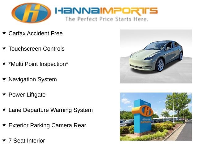 Why shop with Hanna Imports? We specialize in hand-selecting top-quality used cars, trucks, and SUVs for drivers across Raleigh, Durham, Cary, Chapel Hill, and the greater Triangle area of North Carolina. Our massive selection of 1,000+ vehicles on our Raleigh lot is carefully curated to include the most sought-after models, all priced below market value. We believe in transparency and efficiency—our vehicles are aggressively priced from the start, which means no haggling, no hassle, and no wasted time. The price you see is our absolute best price. Whether you're coming from Wake Forest, Apex, Garner, or anywhere in central NC, we’re committed to making your car-buying experience smooth, affordable, and enjoyable. Come see why Hanna Imports is one of the most trusted used car dealerships in North Carolina! Used Tesla Model Y in Raleigh. Used Tesla Model Y in North Carolina, Model Y Long Range, AWD, 7 Seat Interior, Exterior Parking Camera Rear, Lane Departure Warning System, Navigation System, Power Liftgate, 14 Speakers, 4-Wheel Disc Brakes, 9.0 Axle Ratio, ABS brakes, Air Conditioning, Alloy wheels, Audio memory, Auto High-beam Headlights, Auto tilt-away steering wheel, Auto-dimming door mirrors, Auto-dimming Rear-View mirror, Automatic temperature control, Brake assist, Bumpers: body-color, Compass, Delay-off headlights, Driver door bin, Driver vanity mirror, Dual front impact airbags, Dual front side impact airbags, Electronic Stability Control, Emergency communication system, Four wheel independent suspension, Front anti-roll bar, Front Bucket Seats, Front Center Armrest, Front dual zone A/C, Front fog lights, Front reading lights, Fully automatic headlights, Genuine wood dashboard insert, Heated door mirrors, Heated front seats, Heated rear seats, Heated steering wheel, HVAC memory, Illuminated entry, Knee airbag, Low tire pressure warning, Memory seat, Occupant sensing airbag, Outside temperature display, Overhead airbag, Passenger door bin, Passenger vanity mirror, Power door mirrors, Power driver seat, Power passenger seat, Power steering, Power windows, Premium Audio System, Radio data system, Rain sensing wipers, Rear reading lights, Rear seat center armrest, Rear window defroster, Security system, Speed control, Speed-sensing steering, Split folding rear seat, Steering wheel memory, Steering wheel mounted A/C controls, Steering wheel mounted audio controls, Telescoping steering wheel, Tilt steering wheel, Traction control, Trip computer, Variably intermittent wipers, Vegan Leather Seat Trim, and Wheels: 19 x 9.5 Gemini.