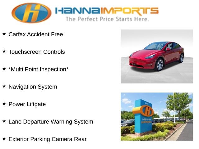 Why shop with Hanna Imports? We specialize in hand-selecting top-quality used cars, trucks, and SUVs for drivers across Raleigh, Durham, Cary, Chapel Hill, and the greater Triangle area of North Carolina. Our massive selection of 1,000+ vehicles on our Raleigh lot is carefully curated to include the most sought-after models, all priced below market value. We believe in transparency and efficiency—our vehicles are aggressively priced from the start, which means no haggling, no hassle, and no wasted time. The price you see is our absolute best price. Whether you're coming from Wake Forest, Apex, Garner, or anywhere in central NC, we’re committed to making your car-buying experience smooth, affordable, and enjoyable. Come see why Hanna Imports is one of the most trusted used car dealerships in North Carolina! Used Tesla Model Y in Raleigh. Used Tesla Model Y in North Carolina, Model Y Long Range, AWD, Exterior Parking Camera Rear, Lane Departure Warning System, Navigation System, Power Liftgate, 14 Speakers, 4-Wheel Disc Brakes, 5 Seat Interior, 9.0 Axle Ratio, ABS brakes, Air Conditioning, Alloy wheels, Audio memory, Auto High-beam Headlights, Auto tilt-away steering wheel, Auto-dimming door mirrors, Auto-dimming Rear-View mirror, Automatic temperature control, Brake assist, Bumpers: body-color, Compass, Delay-off headlights, Driver door bin, Driver vanity mirror, Dual front impact airbags, Dual front side impact airbags, Electronic Stability Control, Emergency communication system, Four wheel independent suspension, Front anti-roll bar, Front Bucket Seats, Front Center Armrest, Front dual zone A/C, Front fog lights, Front reading lights, Fully automatic headlights, Genuine wood dashboard insert, Heated door mirrors, Heated front seats, Heated rear seats, Heated steering wheel, HVAC memory, Illuminated entry, Knee airbag, Low tire pressure warning, Memory seat, Occupant sensing airbag, Outside temperature display, Overhead airbag, Passenger door bin, Passenger vanity mirror, Power door mirrors, Power driver seat, Power passenger seat, Power steering, Power windows, Premium Audio System, Radio data system, Rain sensing wipers, Rear reading lights, Rear seat center armrest, Rear window defroster, Security system, Speed control, Speed-sensing steering, Split folding rear seat, Steering wheel memory, Steering wheel mounted A/C controls, Steering wheel mounted audio controls, Telescoping steering wheel, Tilt steering wheel, Traction control, Trip computer, Variably intermittent wipers, Vegan Leather Seat Trim, and Wheels: 19 x 9.5 Gemini.