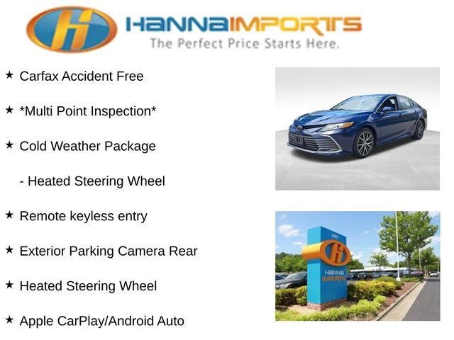 Why shop with Hanna Imports? We specialize in hand-selecting top-quality used cars, trucks, and SUVs for drivers across Raleigh, Durham, Cary, Chapel Hill, and the greater Triangle area of North Carolina. Our massive selection of 1,000+ vehicles on our Raleigh lot is carefully curated to include the most sought-after models, all priced below market value. We believe in transparency and efficiency—our vehicles are aggressively priced from the start, which means no haggling, no hassle, and no wasted time. The price you see is our absolute best price. Whether you're coming from Wake Forest, Apex, Garner, or anywhere in central NC, we’re committed to making your car-buying experience smooth, affordable, and enjoyable. Come see why Hanna Imports is one of the most trusted used car dealerships in North Carolina! Used Toyota Camry in Raleigh. Used Toyota Camry in North Carolina, Cold Weather Package (Heated Steering Wheel), Camry XLE, Black w/Perforated Leather Seat Trim, Apple CarPlay/Android Auto, Exterior Parking Camera Rear, Heated front seats, Remote keyless entry, 4-Wheel Disc Brakes, 6 Speakers, 8.0J x 18 Alloy Wheels, ABS brakes, Air Conditioning, Alloy wheels, AM/FM radio: SiriusXM, Auto High-beam Headlights, Auto-dimming Rear-View mirror, Automatic temperature control, Brake assist, Bumpers: body-color, Delay-off headlights, Driver door bin, Driver vanity mirror, Dual front impact airbags, Dual front side impact airbags, Electronic Stability Control, Emergency communication system: Safety Connect (1-year trial), Four wheel independent suspension, Front anti-roll bar, Front Bucket Seats, Front Center Armrest, Front dual zone A/C, Front reading lights, Fully automatic headlights, Garage door transmitter: HomeLink, Heated door mirrors, Illuminated entry, Knee airbag, Leather steering wheel, Low tire pressure warning, Multi-Stage Heated Front Bucket Seats, Occupant sensing airbag, Outside temperature display, Overhead airbag, Overhead console, Panic alarm, Passenger door bin, Passenger vanity mirror, Perforated Leather Seat Trim, Power door mirrors, Power driver seat, Power passenger seat, Power steering, Power windows, Radio data system, Radio: Audio Plus, Rear anti-roll bar, Rear reading lights, Rear seat center armrest, Rear side impact airbag, Rear window defroster, Security system, Speed control, Speed-sensing steering, Split folding rear seat, Steering wheel mounted audio controls, Tachometer, Telescoping steering wheel, Tilt steering wheel, Traction control, Trip computer, Turn signal indicator mirrors, and Variably intermittent wipers.