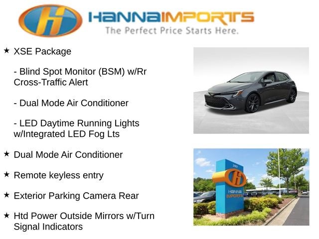 Why shop with Hanna Imports? We specialize in hand-selecting top-quality used cars, trucks, and SUVs for drivers across Raleigh, Durham, Cary, Chapel Hill, and the greater Triangle area of North Carolina. Our massive selection of 1,000+ vehicles on our Raleigh lot is carefully curated to include the most sought-after models, all priced below market value. We believe in transparency and efficiency—our vehicles are aggressively priced from the start, which means no haggling, no hassle, and no wasted time. The price you see is our absolute best price. Whether you're coming from Wake Forest, Apex, Garner, or anywhere in central NC, we’re committed to making your car-buying experience smooth, affordable, and enjoyable. Come see why Hanna Imports is one of the most trusted used car dealerships in North Carolina! Used Toyota Corolla Hatchback in Raleigh. Used Toyota Corolla Hatchback in North Carolina, XSE Package (Blind Spot Monitor (BSM) w/Rr Cross-Traffic Alert, Dual Mode Air Conditioner, Htd Power Outside Mirrors w/Turn Signal Indicators, and LED Daytime Running Lights w/Integrated LED Fog Lts), Corolla Hatchback XSE, Exterior Parking Camera Rear, Navigation system: Drive Connect Cloud Navigation (1-year trial subscription), Remote keyless entry, 4-Wheel Disc Brakes, 8 Speakers, ABS brakes, Air Conditioning, Alloy wheels, AM/FM radio: SiriusXM, Auto High-beam Headlights, Automatic temperature control, Brake assist, Bumpers: body-color, Compass, Delay-off headlights, Driver door bin, Driver vanity mirror, Dual front impact airbags, Dual front side impact airbags, Electronic Stability Control, Emergency communication system: Safety Connect (up to 10-year trial subscription), Fabric/SofTex Seat Trim, Four wheel independent suspension, Front anti-roll bar, Front Bucket Seats, Front Center Armrest, Front dual zone A/C, Front fog lights, Front reading lights, Heated door mirrors, Heated front seats, Heated Sport Front Seats, Illuminated entry, Knee airbag, Leather Shift Knob, Leather steering wheel, Low tire pressure warning, Occupant sensing airbag, Outside temperature display, Overhead airbag, Overhead console, Panic alarm, Passenger door bin, Passenger vanity mirror, Power door mirrors, Power driver seat, Power steering, Power windows, Radio data system, Radio: 8 Toyota Audio Multimedia, Rear anti-roll bar, Rear seat center armrest, Rear side impact airbag, Rear window defroster, Rear window wiper, Security system, Speed control, Speed-sensing steering, Split folding rear seat, Spoiler, Steering wheel mounted audio controls, Tachometer, Telescoping steering wheel, Tilt steering wheel, Traction control, Trip computer, Turn signal indicator mirrors, Variably intermittent wipers, and Wheels: 18 Gloss Graphite Aluminum.