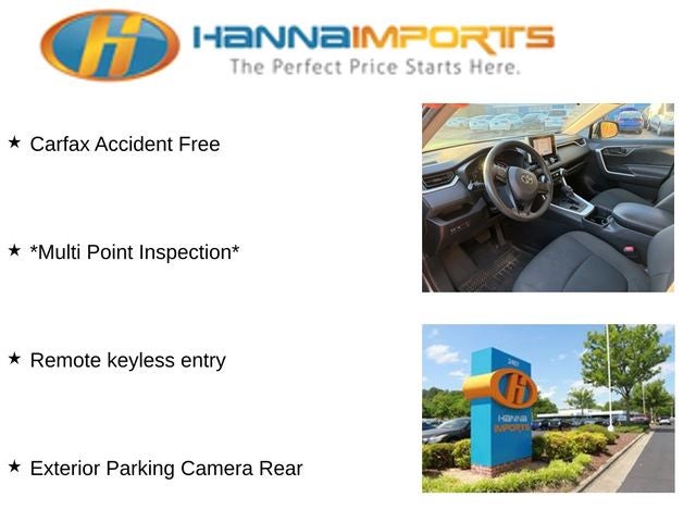 Why shop with Hanna Imports? We specialize in hand-selecting top-quality used cars, trucks, and SUVs for drivers across Raleigh, Durham, Cary, Chapel Hill, and the greater Triangle area of North Carolina. Our massive selection of 1,000+ vehicles on our Raleigh lot is carefully curated to include the most sought-after models, all priced below market value. We believe in transparency and efficiency—our vehicles are aggressively priced from the start, which means no haggling, no hassle, and no wasted time. The price you see is our absolute best price. Whether you're coming from Wake Forest, Apex, Garner, or anywhere in central NC, we’re committed to making your car-buying experience smooth, affordable, and enjoyable. Come see why Hanna Imports is one of the most trusted used car dealerships in North Carolina! Used Toyota RAV4 in Raleigh. Used Toyota RAV4 in North Carolina, RAV4 LE, AWD, Black w/Fabric Seat Trim, Exterior Parking Camera Rear, Remote keyless entry, 17 Steel Wheels, 4-Wheel Disc Brakes, 6 Speakers, ABS brakes, Air Conditioning, AM/FM radio: SiriusXM, Auto High-beam Headlights, Axle Ratio: 3.177, Brake assist, Bumpers: body-color, Driver door bin, Driver vanity mirror, Dual front impact airbags, Dual front side impact airbags, Electronic Stability Control, Emergency communication system: Safety Connect (10-year trial), Fabric Seat Trim, Four wheel independent suspension, Front anti-roll bar, Front Bucket Seats, Front Center Armrest, Front reading lights, Illuminated entry, Knee airbag, Low tire pressure warning, Occupant sensing airbag, Outside temperature display, Overhead airbag, Overhead console, Panic alarm, Passenger door bin, Passenger vanity mirror, Power door mirrors, Power steering, Power windows, Radio data system, Radio: AM/FM/XM Audio System, Rear anti-roll bar, Rear seat center armrest, Rear window defroster, Rear window wiper, Speed control, Speed-sensing steering, Split folding rear seat, Spoiler, Steering wheel mounted audio controls, Tachometer, Telescoping steering wheel, Tilt steering wheel, Traction control, and Trip computer.