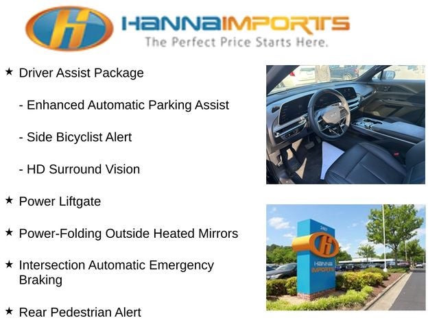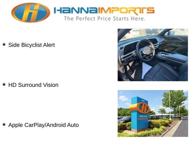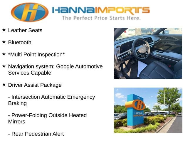 Why shop with Hanna Imports? We specialize in hand-selecting top-quality used cars, trucks, and SUVs for drivers across Raleigh, Durham, Cary, Chapel Hill, and the greater Triangle area of North Carolina. Our massive selection of 1,000+ vehicles on our Raleigh lot is carefully curated to include the most sought-after models, all priced below market value. We believe in transparency and efficiency—our vehicles are aggressively priced from the start, which means no haggling, no hassle, and no wasted time. The price you see is our absolute best price. Whether you're coming from Wake Forest, Apex, Garner, or anywhere in central NC, we’re committed to making your car-buying experience smooth, affordable, and enjoyable. Come see why Hanna Imports is one of the most trusted used car dealerships in North Carolina! Used Cadillac LYRIQ in Raleigh. Used Cadillac LYRIQ in North Carolina, Driver Assist Package (Enhanced Automatic Parking Assist, HD Surround Vision, Intersection Automatic Emergency Braking, Power-Folding Outside Heated Mirrors, Rear Pedestrian Alert, and Side Bicyclist Alert), Floor Liner Package (LPO) (All-Weather Integrated Cargo Liner (LPO) and Front & Rear All-Weather Floor Liners (LPO)), LYRIQ Luxury, AWD, Apple CarPlay/Android Auto, Navigation system: Google Automotive Services Capable, Power Liftgate, 11.63 Axle Ratio, 4-Wheel Disc Brakes, 8-Way Power Driver Seat Adjuster, ABS brakes, Air Conditioning, Alloy wheels, AM/FM radio: SiriusXM with 360L, Auto High-beam Headlights, Auto-dimming door mirrors, Auto-dimming Rear-View mirror, Automatic temperature control, Battery Pack Origin, Brake assist, Bumpers: body-color, Compass, Delay-off headlights, Driver & Front Passenger Heated Seats, Driver 4-Way Power Lumbar Seat Adjustment, Driver door bin, Driver vanity mirror, Dual front impact airbags, Dual front side impact airbags, Electronic Stability Control, Emergency communication system: OnStar and Cadillac connected services capable, Four wheel independent suspension, Front anti-roll bar, Front Bucket Seats, Front Center Armrest, Front dual zone A/C, Front Passenger 4-Way Power Lumbar Seat Adjustment, Front reading lights, Fully automatic headlights, Garage door transmitter, Heated door mirrors, Heated front seats, Heated steering wheel, Hitch Guidance w/Trailering Assist Guideline, Hitch View, Illuminated entry, Inteluxe Seat Trim, Knee airbag, Leather steering wheel, Low tire pressure warning, Memory seat, Occupant sensing airbag, Outside temperature display, Overhead airbag, Overhead console, Panic alarm, Passenger door bin, Passenger vanity mirror, Power door mirrors, Power driver seat, Power passenger seat, Power steering, Power windows, Premium Suspension, Puddle Lamps w/Cadillac Crest (LPO), Radio data system, Radio: Google Built-In Infotainment Experience, Rain sensing wipers, Rear anti-roll bar, Rear reading lights, Rear seat center armrest, Rear window defroster, Remote keyless entry, Security system, SiriusXM w/360L, Speed control, Speed-sensing steering, Split folding rear seat, Spoiler, Steering wheel memory, Steering wheel mounted audio controls, Telescoping steering wheel, Tilt steering wheel, Traction control, Trip computer, Turn signal indicator mirrors, Variably intermittent wipers, and Wheels: 20 Split 6-Spoke Alloy.
