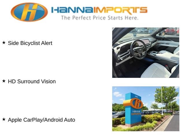 Why shop with Hanna Imports? We specialize in hand-selecting top-quality used cars, trucks, and SUVs for drivers across Raleigh, Durham, Cary, Chapel Hill, and the greater Triangle area of North Carolina. Our massive selection of 1,000+ vehicles on our Raleigh lot is carefully curated to include the most sought-after models, all priced below market value. We believe in transparency and efficiency—our vehicles are aggressively priced from the start, which means no haggling, no hassle, and no wasted time. The price you see is our absolute best price. Whether you're coming from Wake Forest, Apex, Garner, or anywhere in central NC, we’re committed to making your car-buying experience smooth, affordable, and enjoyable. Come see why Hanna Imports is one of the most trusted used car dealerships in North Carolina! Used Cadillac LYRIQ in Raleigh. Used Cadillac LYRIQ in North Carolina, Driver Assist Package (Enhanced Automatic Parking Assist, HD Surround Vision, Intersection Automatic Emergency Braking, Power-Folding Outside Heated Mirrors, Rear Pedestrian Alert, and Side Bicyclist Alert), LYRIQ Luxury, Apple CarPlay/Android Auto, Navigation system: Google Automotive Services Capable, Power Liftgate, 11.63 Axle Ratio, 4-Wheel Disc Brakes, 8-Way Power Driver Seat Adjuster, ABS brakes, Air Conditioning, Alloy wheels, AM/FM radio: SiriusXM with 360L, Auto High-beam Headlights, Auto-dimming door mirrors, Auto-dimming Rear-View mirror, Automatic temperature control, Battery Pack Origin, Brake assist, Bumpers: body-color, Compass, Delay-off headlights, Driver & Front Passenger Heated Seats, Driver 4-Way Power Lumbar Seat Adjustment, Driver door bin, Driver vanity mirror, Dual front impact airbags, Dual front side impact airbags, Electronic Stability Control, Emergency communication system: OnStar and Cadillac connected services capable, Four wheel independent suspension, Front anti-roll bar, Front Bucket Seats, Front Center Armrest, Front dual zone A/C, Front License Plate Bracket, Front Passenger 4-Way Power Lumbar Seat Adjustment, Front reading lights, Fully automatic headlights, Garage door transmitter, Heated door mirrors, Heated front seats, Heated steering wheel, Illuminated entry, Inteluxe Seat Trim, Knee airbag, Leather steering wheel, Low tire pressure warning, Memory seat, Occupant sensing airbag, Outside temperature display, Overhead airbag, Overhead console, Panic alarm, Passenger door bin, Passenger vanity mirror, Power door mirrors, Power driver seat, Power passenger seat, Power steering, Power windows, Premium Suspension, Radio data system, Radio: Google Built-In Infotainment Experience, Rain sensing wipers, Rear anti-roll bar, Rear reading lights, Rear seat center armrest, Rear window defroster, Remote keyless entry, Security system, SiriusXM w/360L, Speed control, Speed-sensing steering, Split folding rear seat, Spoiler, Steering wheel memory, Steering wheel mounted audio controls, Telescoping steering wheel, Tilt steering wheel, Traction control, Trip computer, Turn signal indicator mirrors, Variably intermittent wipers, and Wheels: 20 Split 6-Spoke Alloy.