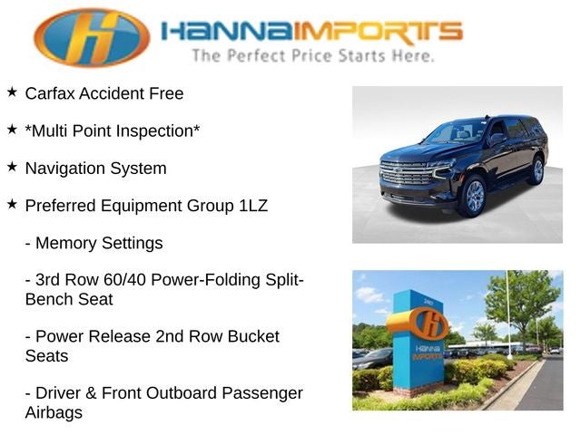 Why shop with Hanna Imports? We specialize in hand-selecting top-quality used cars, trucks, and SUVs for drivers across Raleigh, Durham, Cary, Chapel Hill, and the greater Triangle area of North Carolina. Our massive selection of 1,000+ vehicles on our Raleigh lot is carefully curated to include the most sought-after models, all priced below market value. We believe in transparency and efficiency—our vehicles are aggressively priced from the start, which means no haggling, no hassle, and no wasted time. The price you see is our absolute best price. Whether you're coming from Wake Forest, Apex, Garner, or anywhere in central NC, we’re committed to making your car-buying experience smooth, affordable, and enjoyable. Come see why Hanna Imports is one of the most trusted used car dealerships in North Carolina! Used Chevrolet Tahoe in Raleigh. Used Chevrolet Tahoe in North Carolina, Preferred Equipment Group 1LZ (1st & 2nd Row Color-Keyed Carpeted Floor Mats, 2-Speed Active Electronic AutoTrac Transfer Case, 3rd Row 60/40 Power-Folding Split-Bench Seat, Auto-Dimming Inside Rear-View Mirror, Bose 10-Speaker Centerpoint Surround Audio Sys Ft, Bright Front & Rear Door Sill Plates, Chrome Door Handles w/Body-Color Strip, Chrome Mirror Caps, Color-Keyed Carpeting Floor Covering, Driver & Front Outboard Passenger Airbags, Dual Exhaust System, Enhanced Driver Information Center, Floor Console, Hands-Free Rear Power Programmable Liftgate, Heated 2nd Row Outboard Seats, Heated Steering Wheel, Hill Descent Control, Lane Change Alert w/Side Blind Zone Alert, LED Daytime Running Lamps, Memory Settings, Outside Heated Power-Adjustable Mirrors, Power Release 2nd Row Bucket Seats, Power Tilt & Telescopic Steering Column, Rear Cross Traffic Alert, Remote Start, Safety Alert Seat, SiriusXM w/360L, Universal Home Remote, Wireless Charging, and Wrapped Steering Wheel), Tahoe Premier, 4WD, Jet Black Leather, Navigation System, 10 Speakers, 12-Way Power Driver & Passenger Seat Adjusters, 20 x 9 Polished Aluminum Wheels, 3.23 Rear Axle Ratio, 3rd row seats: split-bench, 4-Wheel Disc Brakes, ABS brakes, Adaptive suspension, Air Conditioning, Alloy wheels, AM/FM radio: SiriusXM with 360L, Apple CarPlay/Android Auto, Auto High-beam Headlights, Auto-dimming door mirrors, Auto-dimming Rear-View mirror, Auto-leveling suspension, Automatic temperature control, Brake assist, Bumpers: body-color, Compass, Delay-off headlights, Driver & Front Passenger Heated & Ventilated Seats, Driver door bin, Driver vanity mirror, Dual front impact airbags, Dual front side impact airbags, Electronic Stability Control, Emergency communication system: OnStar and Chevrolet connected services capable, Four wheel independent suspension, Front anti-roll bar, Front Bucket Seats, Front Center Armrest, Fro