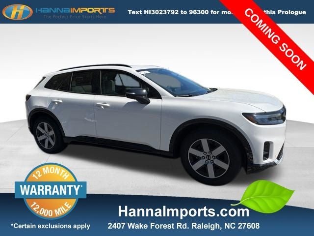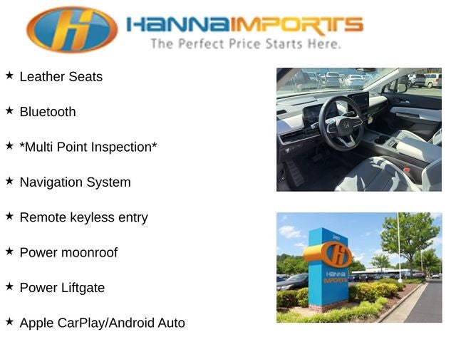 Why shop with Hanna Imports? We specialize in hand-selecting top-quality used cars, trucks, and SUVs for drivers across Raleigh, Durham, Cary, Chapel Hill, and the greater Triangle area of North Carolina. Our massive selection of 1,000+ vehicles on our Raleigh lot is carefully curated to include the most sought-after models, all priced below market value. We believe in transparency and efficiency—our vehicles are aggressively priced from the start, which means no haggling, no hassle, and no wasted time. The price you see is our absolute best price. Whether you're coming from Wake Forest, Apex, Garner, or anywhere in central NC, we’re committed to making your car-buying experience smooth, affordable, and enjoyable. Come see why Hanna Imports is one of the most trusted used car dealerships in North Carolina! Used Honda Prologue in Raleigh. Used Honda Prologue in North Carolina, Prologue Touring, Apple CarPlay/Android Auto, Navigation System, Power Liftgate, Power moonroof, Remote keyless entry, 12 Speakers, 19 x 8.5 Alloy Wheels, 4-Wheel Disc Brakes, ABS brakes, Air Conditioning, Alloy wheels, AM/FM radio: SiriusXM, Auto High-beam Headlights, Auto-dimming Rear-View mirror, Automatic temperature control, Axle Ratio: TBD, Bose Premium Audio System, Brake assist, Bumpers: body-color, Compass, Delay-off headlights, Driver door bin, Driver vanity mirror, Dual front impact airbags, Dual front side impact airbags, Electronic Stability Control, Emergency communication system: HondaLink connected by OnStar, Exterior Parking Camera Rear, Four wheel independent suspension, Front anti-roll bar, Front Bucket Seats, Front Center Armrest, Front dual zone A/C, Front fog lights, Front reading lights, Fully automatic headlights, Garage door transmitter: HomeLink, Heated door mirrors, Heated Front Bucket Seats, Heated front seats, Illuminated entry, Knee airbag, Lane departure: Lane Keeping Assist System (LKAS) active, Leather Seat Trim, Leather steering wheel, Low tire pressure warning, Memory seat, Occupant sensing airbag, Outside temperature display, Overhead airbag, Overhead console, Panic alarm, Passenger door bin, Passenger vanity mirror, Power door mirrors, Power driver seat, Power passenger seat, Power steering, Power windows, Rear anti-roll bar, Rear reading lights, Rear seat center armrest, Rear window defroster, Rear window wiper, Speed control, Split folding rear seat, Spoiler, Steering wheel mounted audio controls, Telescoping steering wheel, Tilt steering wheel, Traction control, Trip computer, Turn signal indicator mirrors, and Variably intermittent wipers.