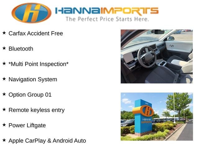 Why shop with Hanna Imports? We specialize in hand-selecting top-quality used cars, trucks, and SUVs for drivers across Raleigh, Durham, Cary, Chapel Hill, and the greater Triangle area of North Carolina. Our massive selection of 1,000+ vehicles on our Raleigh lot is carefully curated to include the most sought-after models, all priced below market value. We believe in transparency and efficiency—our vehicles are aggressively priced from the start, which means no haggling, no hassle, and no wasted time. The price you see is our absolute best price. Whether you're coming from Wake Forest, Apex, Garner, or anywhere in central NC, we’re committed to making your car-buying experience smooth, affordable, and enjoyable. Come see why Hanna Imports is one of the most trusted used car dealerships in North Carolina! Used Hyundai IONIQ 5 in Raleigh. Used Hyundai IONIQ 5 in North Carolina, Option Group 01, IONIQ 5 SEL, AWD, Apple CarPlay & Android Auto, Heated Front Bucket Seats, Navigation System, Power Liftgate, Remote keyless entry, 4-Wheel Disc Brakes, 4.71 Axle Ratio, 6 Speakers, ABS brakes, Air Conditioning, Alloy Door Scuff Plates, Alloy wheels, AM/FM radio: SiriusXM, Auto High-beam Headlights, Auto-dimming Rear-View mirror, Automatic temperature control, Bodyside moldings, Brake assist, Bumpers: body-color, Cargo Net, Carpeted Floor Mats, Charging Port Applique, Delay-off headlights, Driver door bin, Driver vanity mirror, Dual front impact airbags, Dual front side impact airbags, Electronic Stability Control, Emergency communication system: Bluelink+, Four wheel independent suspension, Front anti-roll bar, Front Bucket Seats, Front Center Armrest w/Storage, Front dual zone A/C, Front reading lights, Fully automatic headlights, Garage door transmitter: HomeLink, harman/kardon® Speakers, Heated door mirrors, Heated front seats, Heated steering wheel, Illuminated entry, Leather steering wheel, Low tire pressure warning, Mudguards, Occupant sensing airbag, Outside temperature display, Overhead airbag, Overhead console, Panic alarm, Passenger door bin, Passenger vanity mirror, Power door mirrors, Power driver seat, Power steering, Power windows, Radio: AM/FM/SiriusXM/HD Display Audio System, Rear anti-roll bar, Rear reading lights, Rear side impact airbag, Rear window defroster, Security system, Speed control, Speed-sensing steering, Split folding rear seat, Spoiler, Stain-Resistant Cloth Seating Surfaces, Steering wheel mounted audio controls, Telescoping steering wheel, Tilt steering wheel, Traction control, Trip computer, Turn signal indicator mirrors, Variably intermittent wipers, and Wheels: 19 x 7.5J Aero Alloy.