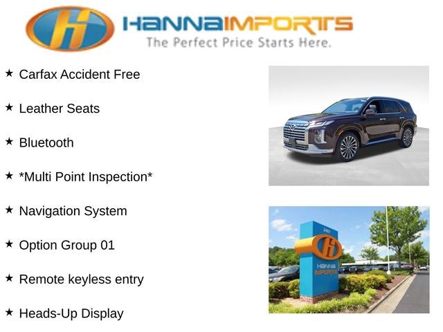 Why shop with Hanna Imports? We specialize in hand-selecting top-quality used cars, trucks, and SUVs for drivers across Raleigh, Durham, Cary, Chapel Hill, and the greater Triangle area of North Carolina. Our massive selection of 1,000+ vehicles on our Raleigh lot is carefully curated to include the most sought-after models, all priced below market value. We believe in transparency and efficiency—our vehicles are aggressively priced from the start, which means no haggling, no hassle, and no wasted time. The price you see is our absolute best price. Whether you're coming from Wake Forest, Apex, Garner, or anywhere in central NC, we’re committed to making your car-buying experience smooth, affordable, and enjoyable. Come see why Hanna Imports is one of the most trusted used car dealerships in North Carolina! Used Hyundai Palisade in Raleigh. Used Hyundai Palisade in North Carolina, Option Group 01, Palisade Calligraphy, AWD, Apple CarPlay & Android Auto, Auto-leveling suspension, Exterior Parking Camera Rear, Heads-Up Display, Heated & Ventilated Front Bucket Seats, Navigation System, Power Liftgate, Power moonroof, Remote keyless entry, Ventilated front seats, Ventilated rear seats, Wheels: 20 x 7.5J Calligraphy Exclusive Alloy, 12 Speakers, 3.648 Axle Ratio, 3rd row seats: split-bench, 4-Wheel Disc Brakes, ABS brakes, Air Conditioning, Alloy wheels, AM/FM radio: SiriusXM, Auto High-beam Headlights, Auto-dimming door mirrors, Auto-dimming Rear-View mirror, Automatic temperature control, Brake assist, Bumper Applique, Bumpers: body-color, Carpeted Floor Mats, Compass, Delay-off headlights, Driver door bin, Driver vanity mirror, Dual front impact airbags, Dual front side impact airbags, Electronic Stability Control, Emergency communication system, Four wheel independent suspension, Front anti-roll bar, Front Bucket Seats, Front Center Armrest, Front dual zone A/C, Front reading lights, Fully automatic headlights, Garage door transmitter: HomeLink, harman/kardon® Speakers, Heated door mirrors, Heated front seats, Heated rear seats, Heated steering wheel, Illuminated entry, Knee airbag, Low tire pressure warning, Memory seat, Occupant sensing airbag, Outside temperature display, Overhead airbag, Overhead console, Panic alarm, Passenger door bin, Passenger vanity mirror, Power door mirrors, Power driver seat, Power passenger seat, Power steering, Power windows, Premium Nappa Leather Seat Trim, Radio data system, Radio: AM/FM/MP3 Premium Audio System, Rain sensing wipers, Rear air conditioning, Rear anti-roll bar, Rear audio controls, Rear reading lights, Rear side impact airbag, Rear window defroster, Rear window wiper, Reclining 3rd row seat, Security system, Speed control, Speed-sensing steering, Split folding rear seat, Spoiler, Steering wheel mounted audio controls, Tachometer, Telescoping steering wheel, Tilt steering wheel, Traction control, Trip computer, Turn signal indicator mirrors, and Variably intermittent wipers.
