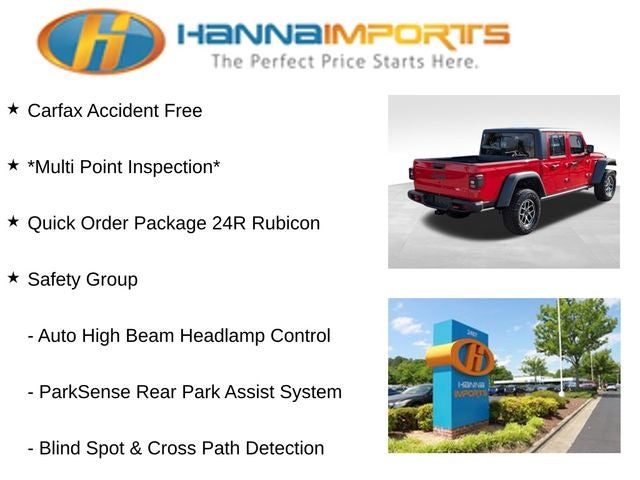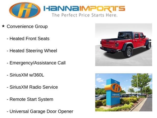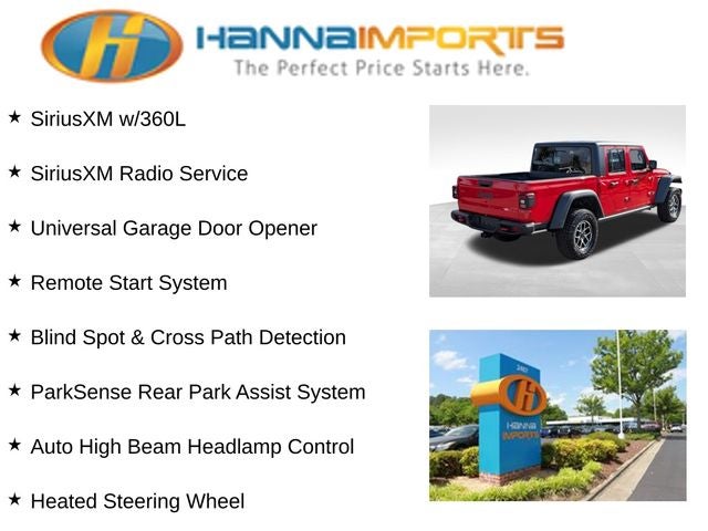 Why shop with Hanna Imports? We specialize in hand-selecting top-quality used cars, trucks, and SUVs for drivers across Raleigh, Durham, Cary, Chapel Hill, and the greater Triangle area of North Carolina. Our massive selection of 1,000+ vehicles on our Raleigh lot is carefully curated to include the most sought-after models, all priced below market value. We believe in transparency and efficiency—our vehicles are aggressively priced from the start, which means no haggling, no hassle, and no wasted time. The price you see is our absolute best price. Whether you're coming from Wake Forest, Apex, Garner, or anywhere in central NC, we’re committed to making your car-buying experience smooth, affordable, and enjoyable. Come see why Hanna Imports is one of the most trusted used car dealerships in North Carolina! Used Jeep Gladiator in Raleigh. Used Jeep Gladiator in North Carolina, Convenience Group (Emergency/Assistance Call, Heated Front Seats, Heated Steering Wheel, Remote Start System, SiriusXM Radio Service, SiriusXM w/360L, and Universal Garage Door Opener), Quick Order Package 24R Rubicon, Safety Group (Auto High Beam Headlamp Control, Blind Spot & Cross Path Detection, and ParkSense Rear Park Assist System), Gladiator Rubicon, 4D Crew Cab, 4WD, Apple CarPlay, Apple CarPlay/Android Auto, 12.3 Touchscreen Display, 4-Wheel Disc Brakes, 4.10 Rear Axle Ratio, 4G LTE Wi-Fi Hot Spot, 8 Speakers, 97 MPH Vehicle Max Speed Calibration, ABS brakes, Air Conditioning, Alexa Built-In, Alloy wheels, AM/FM radio: SiriusXM with 360L, Automatic temperature control, Black 3-Piece Hard Top, Brake assist, Cloth Low-Back Bucket Seats, Compass, Connectivity - US/Canada, Delay-off headlights, Driver door bin, Driver vanity mirror, Dual front impact airbags, Dual front side impact airbags, Electronic Stability Control, Emergency communication system: Jeep Connect, Freedom Panel Storage Bag, Front anti-roll bar, Front Bucket Seats, Front Center Armrest w/Storage, Front dual zone A/C, Front fog lights, Front reading lights, Fully automatic headlights, Google Android Auto, Heated door mirrors, Illuminated entry, Integrated Center Stack Radio, Integrated roll-over protection, Low tire pressure warning, Manufacturer's Statement of Origin (DISC), MOPAR All-Weather Slush Mats, MOPAR Spray In Bedliner, Occupant sensing airbag, Outside temperature display, Overhead airbag, Panic alarm, Passenger door bin, Passenger vanity mirror, Performance Suspension, Power door mirrors, Power steering, Power windows, Radio data system, Radio: Uconnect 5 w/12.3 Display, Rear anti-roll bar, Rear reading lights, Rear Sliding Window, Rear Window Defroster, Remote keyless entry, Security system, Speed control, Split folding rear seat, Steering wheel mounted audio controls, Tachometer, Telescoping steering wheel, Tilt steering wheel, Traction control, Trip computer, USB Host Flip, Variably intermittent wipers, Voltmeter, and Wheels: 17 x 7.5 Machined/Painted Black.