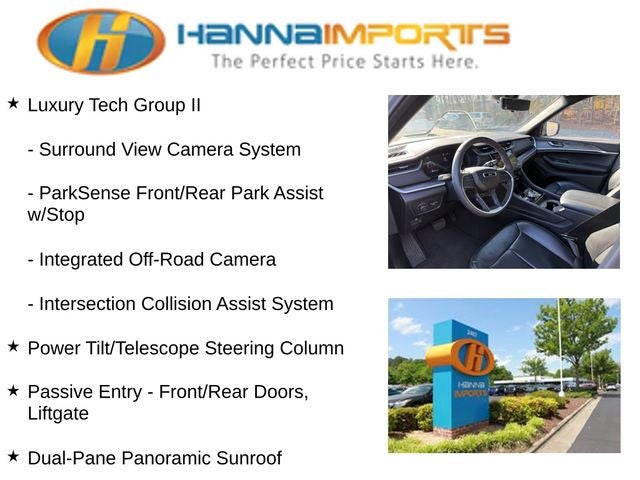 Why shop with Hanna Imports? We specialize in hand-selecting top-quality used cars, trucks, and SUVs for drivers across Raleigh, Durham, Cary, Chapel Hill, and the greater Triangle area of North Carolina. Our massive selection of 1,000+ vehicles on our Raleigh lot is carefully curated to include the most sought-after models, all priced below market value. We believe in transparency and efficiency—our vehicles are aggressively priced from the start, which means no haggling, no hassle, and no wasted time. The price you see is our absolute best price. Whether you're coming from Wake Forest, Apex, Garner, or anywhere in central NC, we’re committed to making your car-buying experience smooth, affordable, and enjoyable. Come see why Hanna Imports is one of the most trusted used car dealerships in North Carolina! Used Jeep Grand Cherokee L in Raleigh. Used Jeep Grand Cherokee L in North Carolina, Luxury Tech Group II (2nd Row Manual Window Shades, Auto-Dimming Exterior Driver Mirror, Capri Leatherette w/Axis II Seats, Integrated Off-Road Camera, Intersection Collision Assist System, Memory Steering Column, ParkSense Front/Rear Park Assist w/Stop, Passive Entry - Front/Rear Doors, Liftgate, Power Tilt/Telescope Steering Column, Rain Sensitive Windshield Wipers, Rear Back Up Camera Washer, Rearview Autodim Digital Display Mirror, Surround View Camera System, Ventilated Front Seats, and Wireless Charging Pad), Quick Order Package 23E, Grand Cherokee L Limited, 4WD, Dual-Pane Panoramic Sunroof, Heated rear seats, Interior Rear Facing Camera, Navigation System, ParkView Rear Back-Up Camera, Power Liftgate, 3.45 Rear Axle Ratio, 3rd row seats: split-bench, 4-Wheel Disc Brakes, 6 Speakers, ABS brakes, Active Noise Control System, Air Conditioning, Alloy wheels, AM/FM radio: SiriusXM with 360L, Anti-whiplash front head restraints, Audio memory, Auto High-beam Headlights, Automatic temperature control, Brake assist, Bumpers: body-color, Capri Leatherette Seats, Compass, Delay-off headlights, Driver door bin, Driver vanity mirror, Dual front impact airbags, Dual front side impact airbags, Electronic Stability Control, Emergency communication system, Four wheel independent suspension, Front anti-roll bar, Front Bucket Seats, Front Center Armrest w/Storage, Front dual zone A/C, Front fog lights, Front License Plate Bracket, Front reading lights, Fully automatic headlights, Garage door transmitter, Heated door mirrors, Heated front seats, Heated steering wheel, Illuminated entry, Knee airbag, Low tire pressure warning, Manual Fold Seatbacks, Memory seat, Normal Duty Suspension, Occupant sensing airbag, Outside temperature display, Overhead airbag, Overhead console, Panic alarm, Passenger door bin, Passenger vanity mirror, Power door mirrors, Power driver seat, Power passenger seat, Power steering, Power windows, Radio data system, Radio: Uconnect 5 Nav w/10.1 Display, Rear air conditioning, Rear anti-roll bar, Rear reading lights, Rear window defroster, Rear window wiper, Reclining 3rd row seat, Remote keyless entry, Security system, Speed control, Speed-Sensitive Wipers, Split folding rear seat, Spoiler, Steering whee