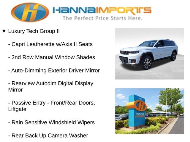 Why shop with Hanna Imports? We specialize in hand-selecting top-quality used cars, trucks, and SUVs for drivers across Raleigh, Durham, Cary, Chapel Hill, and the greater Triangle area of North Carolina. Our massive selection of 1,000+ vehicles on our Raleigh lot is carefully curated to include the most sought-after models, all priced below market value. We believe in transparency and efficiency—our vehicles are aggressively priced from the start, which means no haggling, no hassle, and no wasted time. The price you see is our absolute best price. Whether you're coming from Wake Forest, Apex, Garner, or anywhere in central NC, we’re committed to making your car-buying experience smooth, affordable, and enjoyable. Come see why Hanna Imports is one of the most trusted used car dealerships in North Carolina! Used Jeep Grand Cherokee L in Raleigh. Used Jeep Grand Cherokee L in North Carolina, Luxury Tech Group II (2nd Row Manual Window Shades, Auto-Dimming Exterior Driver Mirror, Capri Leatherette w/Axis II Seats, Integrated Off-Road Camera, Intersection Collision Assist System, Memory Steering Column, ParkSense Front/Rear Park Assist w/Stop, Passive Entry - Front/Rear Doors, Liftgate, Power Tilt/Telescope Steering Column, Rain Sensitive Windshield Wipers, Rear Back Up Camera Washer, Rearview Autodim Digital Display Mirror, Surround View Camera System, Ventilated Front Seats, and Wireless Charging Pad), Quick Order Package 23E, Grand Cherokee L Limited, 4WD, Dual-Pane Panoramic Sunroof, Interior Rear Facing Camera, Navigation System, ParkView Rear Back-Up Camera, Power Liftgate, Remote keyless entry, 3.45 Rear Axle Ratio, 3rd row seats: split-bench, 4-Wheel Disc Brakes, 6 Speakers, ABS brakes, Active Noise Control System, Air Conditioning, Alloy wheels, AM/FM radio: SiriusXM with 360L, Anti-whiplash front head restraints, Audio memory, Auto High-beam Headlights, Automatic temperature control, Brake assist, Bumpers: body-color, Capri Leatherette Seats, Compass, Delay-off headlights, Driver door bin, Driver vanity mirror, Dual front impact airbags, Dual front side impact airbags, Electronic Stability Control, Emergency communication system, Four wheel independent suspension, Front anti-roll bar, Front Bucket Seats, Front Center Armrest w/Storage, Front dual zone A/C, Front fog lights, Front License Plate Bracket, Front reading lights, Fully automatic headlights, Garage door transmitter, Heated door mirrors, Heated front seats, Heated rear seats, Heated steering wheel, Illuminated entry, Knee airbag, Low tire pressure warning, Manual Fold Seatbacks, Memory seat, Normal Duty Suspension, Occupant sensing airbag, Outside temperature display, Overhead airbag, Overhead console, Panic alarm, Passenger door bin, Passenger vanity mirror, Power door mirrors, Power driver seat, Power passenger seat, Power steering, Power windows, Radio data system, Radio: Uconnect 5 Nav w/10.1 Display, Rear air conditioning, Rear anti-roll bar, Rear reading lights, Rear window defroster, Rear window wiper, Reclining 3rd row seat, Security system, Speed control, Speed-Sensitive W