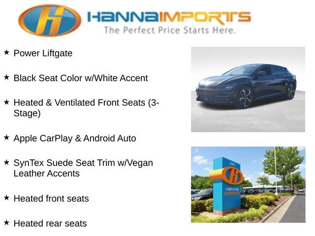 Why shop with Hanna Imports? We specialize in hand-selecting top-quality used cars, trucks, and SUVs for drivers across Raleigh, Durham, Cary, Chapel Hill, and the greater Triangle area of North Carolina. Our massive selection of 1,000+ vehicles on our Raleigh lot is carefully curated to include the most sought-after models, all priced below market value. We believe in transparency and efficiency—our vehicles are aggressively priced from the start, which means no haggling, no hassle, and no wasted time. The price you see is our absolute best price. Whether you're coming from Wake Forest, Apex, Garner, or anywhere in central NC, we’re committed to making your car-buying experience smooth, affordable, and enjoyable. Come see why Hanna Imports is one of the most trusted used car dealerships in North Carolina! Used Kia EV6 in Raleigh. Used Kia EV6 in North Carolina, GT-Line SynTex Suede Seat Package (Black Seat Color w/White Accent and SynTex Suede Seat Trim w/Vegan Leather Accents), EV6 GT-Line, AWD, Apple CarPlay & Android Auto, Heated & Ventilated Front Seats (3-Stage), Heated front seats, Heated rear seats, Navigation system: AVN 5.0 Navigation System, Power Liftgate, Power moonroof, Remote keyless entry, 14 Speakers, 4-Wheel Disc Brakes, ABS brakes, Air Conditioning, Alloy wheels, AM/FM radio: SiriusXM, Auto High-beam Headlights, Auto-dimming Rear-View mirror, Automatic temperature control, Axle Ratio: 10.650, Brake assist, Bumpers: body-color, Cargo Tray w/Luggage Board, Carpet Floor Mats, Delay-off headlights, Driver door bin, Driver vanity mirror, Dual front impact airbags, Dual front side impact airbags, Electronic Stability Control, Emergency communication system, Four wheel independent suspension, Front anti-roll bar, Front Bucket Seats, Front Center Armrest, Front dual zone A/C, Front reading lights, Fully automatic headlights, Garage door transmitter: HomeLink, Heads-Up Display, Heated door mirrors, Heated steering wheel, Illuminated entry, Knee airbag, Low tire pressure warning, Memory seat, Occupant sensing airbag, Outside temperature display, Overhead airbag, Overhead console, Panic alarm, Passenger door bin, Passenger vanity mirror, Power door mirrors, Power driver seat, Power passenger seat, Power steering, Power windows, Radio: Meridian Premium Audio System, Rain sensing wipers, Rear anti-roll bar, Rear seat center armrest, Rear window defroster, Security system, Speed control, Speed-sensing steering, Split folding rear seat, Spoiler, Sport steering wheel, Steering wheel mounted audio controls, Telescoping steering wheel, Tilt steering wheel, Traction control, Trip computer, Turn signal indicator mirrors, Variably intermittent wipers, Vegan Leather Seat Trim, Ventilated front seats, and Wheels: 8.0J x 20 Black Painted Alloy.