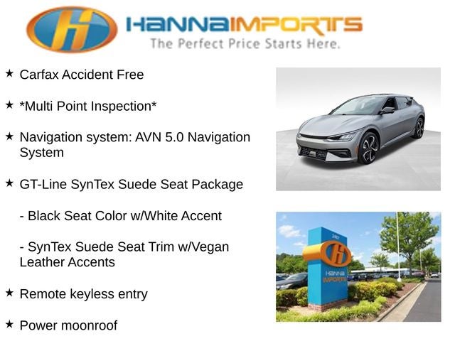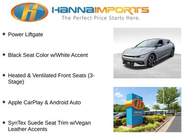 Why shop with Hanna Imports? We specialize in hand-selecting top-quality used cars, trucks, and SUVs for drivers across Raleigh, Durham, Cary, Chapel Hill, and the greater Triangle area of North Carolina. Our massive selection of 1,000+ vehicles on our Raleigh lot is carefully curated to include the most sought-after models, all priced below market value. We believe in transparency and efficiency—our vehicles are aggressively priced from the start, which means no haggling, no hassle, and no wasted time. The price you see is our absolute best price. Whether you're coming from Wake Forest, Apex, Garner, or anywhere in central NC, we’re committed to making your car-buying experience smooth, affordable, and enjoyable. Come see why Hanna Imports is one of the most trusted used car dealerships in North Carolina! Used Kia EV6 in Raleigh. Used Kia EV6 in North Carolina, GT-Line SynTex Suede Seat Package (Black Seat Color w/White Accent and SynTex Suede Seat Trim w/Vegan Leather Accents), EV6 GT-Line, AWD, Apple CarPlay & Android Auto, Heated & Ventilated Front Seats (3-Stage), Navigation system: AVN 5.0 Navigation System, Power Liftgate, Power moonroof, Remote keyless entry, 14 Speakers, 4-Wheel Disc Brakes, ABS brakes, Air Conditioning, Alloy wheels, AM/FM radio: SiriusXM, Auto High-beam Headlights, Auto-dimming Rear-View mirror, Automatic temperature control, Axle Ratio: 10.650, Brake assist, Bumpers: body-color, Carpet Floor Mats, Delay-off headlights, Driver door bin, Driver vanity mirror, Dual front impact airbags, Dual front side impact airbags, Electronic Stability Control, Emergency communication system, Four wheel independent suspension, Front anti-roll bar, Front Bucket Seats, Front Center Armrest, Front dual zone A/C, Front reading lights, Fully automatic headlights, Garage door transmitter: HomeLink, Heads-Up Display, Heated door mirrors, Heated front seats, Heated rear seats, Heated steering wheel, Illuminated entry, Knee airbag, Low tire pressure warning, Memory seat, Occupant sensing airbag, Outside temperature display, Overhead airbag, Overhead console, Panic alarm, Passenger door bin, Passenger vanity mirror, Power door mirrors, Power driver seat, Power passenger seat, Power steering, Power windows, Radio: Meridian Premium Audio System, Rain sensing wipers, Rear anti-roll bar, Rear seat center armrest, Rear window defroster, Security system, Speed control, Speed-sensing steering, Split folding rear seat, Spoiler, Sport steering wheel, Steering wheel mounted audio controls, Telescoping steering wheel, Tilt steering wheel, Traction control, Trip computer, Turn signal indicator mirrors, Variably intermittent wipers, Vegan Leather Seat Trim, Ventilated front seats, and Wheels: 8.0J x 20 Black Painted Alloy.
