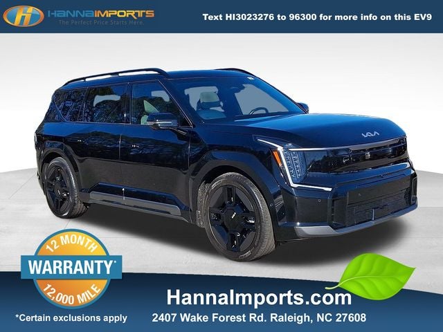 Why shop with Hanna Imports? We specialize in hand-selecting top-quality used cars, trucks, and SUVs for drivers across Raleigh, Durham, Cary, Chapel Hill, and the greater Triangle area of North Carolina. Our massive selection of 1,000+ vehicles on our Raleigh lot is carefully curated to include the most sought-after models, all priced below market value. We believe in transparency and efficiency—our vehicles are aggressively priced from the start, which means no haggling, no hassle, and no wasted time. The price you see is our absolute best price. Whether you're coming from Wake Forest, Apex, Garner, or anywhere in central NC, we’re committed to making your car-buying experience smooth, affordable, and enjoyable. Come see why Hanna Imports is one of the most trusted used car dealerships in North Carolina! Used Kia EV9 in Raleigh. Used Kia EV9 in North Carolina, EV9 GT-Line, AWD, 3rd row seats: split-bench, Exterior Parking Camera Rear, GT-Line Tow Hitch, Navigation System, Power Liftgate, Power moonroof, 13.16 Axle Ratio, 14 Speakers, 4-Wheel Disc Brakes, ABS brakes, Air Conditioning, Alloy wheels, AM/FM radio: SiriusXM, Apple CarPlay & Android Auto, Auto High-beam Headlights, Auto-dimming door mirrors, Auto-dimming Rear-View mirror, Automatic temperature control, Brake assist, Bumpers: body-color, Carpeted Floor Mat, 6-Passenger, Delay-off headlights, Driver door bin, Driver vanity mirror, Dual front impact airbags, Dual front side impact airbags, Electronic Stability Control, Emergency communication system: 911 Connect, Folding Cargo Tray, Four wheel independent suspension, Front & Rear Mud Guards, Front anti-roll bar, Front Bucket Seats, Front Center Armrest w/Storage, Front dual zone A/C, Front reading lights, Fully automatic headlights, Garage door transmitter: HomeLink, GT Rear Bumper Applique, Heads-Up Display, Heated & Ventilated Front Bucket Seats, Heated door mirrors, Heated front seats, Heated rear seats, Heated steering wheel, Illuminated entry, Knee airbag, Low tire pressure warning, Memory seat, Occupant sensing airbag, Outside temperature display, Overhead airbag, Overhead console, Panic alarm, Passenger door bin, Passenger vanity mirror, Power door mirrors, Power driver seat, Power passenger seat, Power steering, Power windows, Radio data system, Radio: AM/FM/MP3/HD Radio/SiriusXM Meridian Audio, Rain sensing wipers, Rear air conditioning, Rear anti-roll bar, Rear reading lights, Rear seat center armrest, Rear window defroster, Rear window wiper, Reclining 3rd row seat, Remote keyless entry, Security system, Smart Key w/ Push Button and Remote Start, Speed control, Speed-sensing steering, Split folding rear seat, Spoiler, Steering wheel memory, Steering wheel mounted audio controls, SynTex Leather Seats, Telescoping steering wheel, Tilt steering wheel, Traction control, Trip computer, Turn signal indicator mirrors, Variably intermittent wipers, Ventilated front seats, Ventilated rear seats, and Wheels: 21 Black & Dark Silver Finish Alloy.