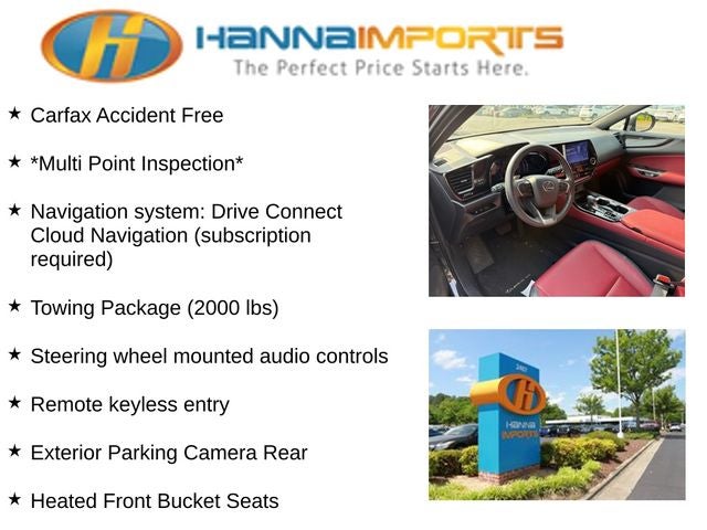 Why shop with Hanna Imports? We specialize in hand-selecting top-quality used cars, trucks, and SUVs for drivers across Raleigh, Durham, Cary, Chapel Hill, and the greater Triangle area of North Carolina. Our massive selection of 1,000+ vehicles on our Raleigh lot is carefully curated to include the most sought-after models, all priced below market value. We believe in transparency and efficiency—our vehicles are aggressively priced from the start, which means no haggling, no hassle, and no wasted time. The price you see is our absolute best price. Whether you're coming from Wake Forest, Apex, Garner, or anywhere in central NC, we’re committed to making your car-buying experience smooth, affordable, and enjoyable. Come see why Hanna Imports is one of the most trusted used car dealerships in North Carolina! Used Lexus NX in Raleigh. Used Lexus NX in North Carolina, Towing Package (2000 lbs), Exterior Parking Camera Rear, Heated Front Bucket Seats, Navigation system: Drive Connect Cloud Navigation (subscription required), Remote keyless entry, Steering wheel mounted audio controls, 10 Speakers, 18 Wheels, 4-Wheel Disc Brakes, ABS brakes, Air Conditioning, Alloy wheels, AM/FM radio: SiriusXM, Anti-whiplash front head restraints, Auto High-beam Headlights, Auto-dimming door mirrors, Auto-dimming Rear-View mirror, Automatic temperature control, Axle Ratio: 3.417, Brake assist, Bumpers: body-color, Delay-off headlights, Driver door bin, Driver vanity mirror, Dual front impact airbags, Dual front side impact airbags, Electronic Stability Control, Emergency communication system: Safety Connect (up to 10-year trial subscription included), Four wheel independent suspension, Front anti-roll bar, Front Bucket Seats, Front Center Armrest, Front dual zone A/C, Front fog lights, Front reading lights, Fully automatic headlights, Garage door transmitter: HomeLink, Heated door mirrors, Heated front seats, Illuminated Cargo Sill, Illuminated Door Sills, Illuminated entry, Knee airbag, Leather Shift Knob, Leather steering wheel, Low tire pressure warning, NuLuxe Seat Trim, Occupant sensing airbag, Outside temperature display, Overhead airbag, Overhead console, Panic alarm, Passenger door bin, Passenger vanity mirror, Power Back Door, Power door mirrors, Power driver seat, Power passenger seat, Power steering, Power windows, Radio data system, Rear anti-roll bar, Rear reading lights, Rear seat center armrest, Rear window defroster, Rear window wiper, Security system, Speed control, Speed-sensing steering, Split folding rear seat, Spoiler, Tachometer, Telescoping steering wheel, Tilt steering wheel, Traction control, Trip computer, Turn signal indicator mirrors, Variably intermittent wipers, Wireless Apple CarPlay/Wireless Android Auto, and Wireless Smart Door Lock.
