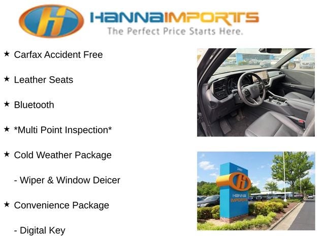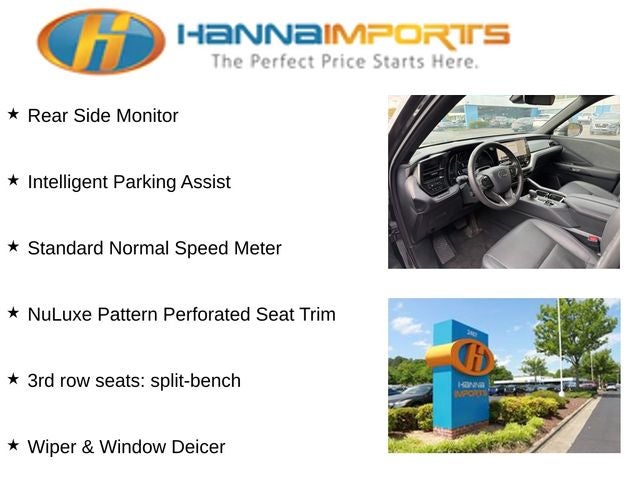 Why shop with Hanna Imports? We specialize in hand-selecting top-quality used cars, trucks, and SUVs for drivers across Raleigh, Durham, Cary, Chapel Hill, and the greater Triangle area of North Carolina. Our massive selection of 1,000+ vehicles on our Raleigh lot is carefully curated to include the most sought-after models, all priced below market value. We believe in transparency and efficiency—our vehicles are aggressively priced from the start, which means no haggling, no hassle, and no wasted time. The price you see is our absolute best price. Whether you're coming from Wake Forest, Apex, Garner, or anywhere in central NC, we’re committed to making your car-buying experience smooth, affordable, and enjoyable. Come see why Hanna Imports is one of the most trusted used car dealerships in North Carolina! Used Lexus TX in Raleigh. Used Lexus TX in North Carolina, Cold Weather Package (Leather Heated Steering Wheel w/Paddles and Wiper & Window Deicer), Convenience Package (Digital Key, Lane Keeping System, Pre-Collision System, and Rear Side Monitor), Technology Package (Intelligent Parking Assist, Peripheral Monitor Camera, and Standard Normal Speed Meter), TX 350 Premium, 3rd row seats: split-bench, Exterior Parking Camera Rear, NuLuxe Pattern Perforated Seat Trim, Power Liftgate, Power moonroof, Remote keyless entry, 12 Speakers, 20 Wheels, 4-Wheel Disc Brakes, ABS brakes, Air Conditioning, Alloy wheels, AM/FM radio, Auto High-beam Headlights, Auto tilt-away steering wheel, Auto-dimming door mirrors, Auto-dimming Rear-View mirror, Automatic temperature control, Brake assist, Bumpers: body-color, Delay-off headlights, Driver door bin, Driver vanity mirror, Dual front impact airbags, Dual front side impact airbags, Electronic Stability Control, Emergency communication system: Safety Connect (10-year trial), Four wheel independent suspension, Front anti-roll bar, Front Bucket Seats, Front Center Armrest, Front dual zone A/C, Front fog lights, Front reading lights, Fully automatic headlights, Garage door transmitter: HomeLink, Heated & Air Conditioned Front Seats, Heated door mirrors, Heated front seats, Illuminated entry, Knee airbag, Leather Shift Knob, Leather steering wheel, Low tire pressure warning, Memory seat, Navigation system: Drive Connect Cloud Navigation (subscription required), Occupant sensing airbag, Outside temperature display, Overhead airbag, Panic alarm, Passenger door bin, Passenger vanity mirror, Power door mirrors, Power driver seat, Power passenger seat, Power steering, Power windows, Radio data system, Radio: Lexus Interface, Rain sensing wipers, Rear air conditioning, Rear anti-roll bar, Rear reading lights, Rear seat center armrest, Rear window defroster, Rear window wiper, Reclining 3rd row seat, Security system, Speed control, Speed-sensing steering, Split folding rear seat, Spoiler, Steering wheel memory, Steering wheel mounted audio controls, Tachometer, TBD Axle Ratio, Telescoping steering wheel, Tilt steering wheel, Traction control, Trip computer, Turn signal indicator mirrors, Variably intermittent wipers, Ventilated front seats, and Wireless Apple CarPlay/Wireless Android Auto.