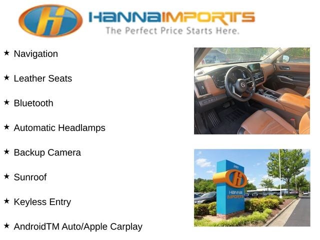 Why shop with Hanna Imports? We specialize in hand-selecting top-quality used cars, trucks, and SUVs for drivers across Raleigh, Durham, Cary, Chapel Hill, and the greater Triangle area of North Carolina. Our massive selection of 1,000+ vehicles on our Raleigh lot is carefully curated to include the most sought-after models, all priced below market value. We believe in transparency and efficiency—our vehicles are aggressively priced from the start, which means no haggling, no hassle, and no wasted time. The price you see is our absolute best price. Whether you're coming from Wake Forest, Apex, Garner, or anywhere in central NC, we’re committed to making your car-buying experience smooth, affordable, and enjoyable. Come see why Hanna Imports is one of the most trusted used car dealerships in North Carolina! Used Nissan Pathfinder in Raleigh. Used Nissan Pathfinder in North Carolina, Cargo Package (Cargo Area Protector, Cargo Net, and First Aid Kit), Pathfinder Platinum, Power Liftgate, Power moonroof, 13 Speakers, 3rd row seats: bench, 4-Wheel Disc Brakes, ABS brakes, Air Conditioning, Alloy wheels, AM/FM radio: SiriusXM, Auto High-beam Headlights, Auto tilt-away steering wheel, Auto-dimming Rear-View mirror, Automatic temperature control, Axle Ratio: 4.334, Bench Seat Carpeted Floor Mats (Set of 4), Black Splash Guards (Set of 4), Bodyside moldings, Bose Premium Audio System, Brake assist, Bumpers: body-color, Cross Bars, Delay-off headlights, Driver door bin, Driver vanity mirror, Dual front impact airbags, Dual front side impact airbags, Electronic Stability Control, Emergency communication system, Exterior Parking Camera Rear, Four wheel independent suspension, Front anti-roll bar, Front Bucket Seats, Front Center Armrest, Front dual zone A/C, Front reading lights, Fully automatic headlights, Garage door transmitter: HomeLink, Heads-Up Display, Heated & Cooled Front Bucket Seats, Heated door mirrors, Heated front seats, Heated rear seats, Heated steering wheel, Illuminated entry, Knee airbag, Leather steering wheel, Low tire pressure warning, Memory seat, Navigation system: NissanConnect with Navigation and Services, NissanConnect featuring Apple CarPlay and Android Auto, NissanConnect w/Navigation & Services, Occupant sensing airbag, Outside temperature display, Overhead airbag, Overhead console, Panic alarm, Passenger door bin, Passenger vanity mirror, Power door mirrors, Power driver seat, Power passenger seat, Power steering, Power windows, Radio data system, Radio: AM/FM Audio System, Rain sensing wipers, Rear air conditioning, Rear anti-roll bar, Rear reading lights, Rear seat center armrest, Rear side impact airbag, Rear window defroster, Rear window wiper, Reclining 3rd row seat, Remote keyless entry, Security system, Semi-Aniline Leather-Appointed Seating Surfaces, Speed control, Speed-sensing steering, Speed-Sensitive Wipers, Split folding rear seat, Spoiler, Steering wheel memory, Steering wheel mounted audio controls, Tachometer, Telescoping steering wheel, Tilt steering wheel, Traction control, Trip computer, Turn signal indicator mirrors, Variably intermittent wipers, Ventilated front seats, and Wheels: 20 x 8J Machined Alloy.