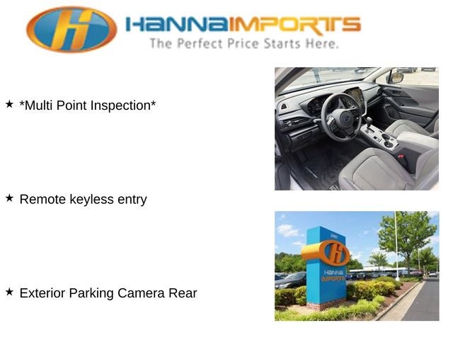 Why shop with Hanna Imports? We specialize in hand-selecting top-quality used cars, trucks, and SUVs for drivers across Raleigh, Durham, Cary, Chapel Hill, and the greater Triangle area of North Carolina. Our massive selection of 1,000+ vehicles on our Raleigh lot is carefully curated to include the most sought-after models, all priced below market value. We believe in transparency and efficiency—our vehicles are aggressively priced from the start, which means no haggling, no hassle, and no wasted time. The price you see is our absolute best price. Whether you're coming from Wake Forest, Apex, Garner, or anywhere in central NC, we’re committed to making your car-buying experience smooth, affordable, and enjoyable. Come see why Hanna Imports is one of the most trusted used car dealerships in North Carolina! Used Subaru Crosstrek in Raleigh. Used Subaru Crosstrek in North Carolina, Standard Model, Crosstrek Premium, Exterior Parking Camera Rear, Remote keyless entry, 3.90 Axle Ratio, 4-Wheel Disc Brakes, 6 Speakers, ABS brakes, Air Conditioning, All-Weather Floor Liners, Alloy wheels, AM/FM radio: SiriusXM, Anti-whiplash front head restraints, Auto High-beam Headlights, Auto-Dimming Mirror w/Compass & HomeLink, Automatic temperature control, Brake assist, Bumpers: body-color, Driver door bin, Driver vanity mirror, Dual front impact airbags, Dual front side impact airbags, Electronic Stability Control, Emergency communication system: STARLINK Safety and Security (Subscription Required), Four wheel independent suspension, Front anti-roll bar, Front Bucket Seats, Front Center Armrest, Front dual zone A/C, Front fog lights, Front reading lights, Fully automatic headlights, Illuminated entry, Knee airbag, LED Upgrade, Low tire pressure warning, Occupant sensing airbag, Outside temperature display, Overhead airbag, Overhead console, Panic alarm, Passenger door bin, Passenger vanity mirror, Power door mirrors, Power steering, Power windows, Premium Cloth Upholstery, Radio data system, Radio: Subaru STARLINK 11.6 Multimedia Plus Sys, Rear anti-roll bar, Rear Bumper Cover, Rear seat center armrest, Rear window defroster, Rear window wiper, Security system, Speed control, Speed-sensing steering, Splash Guards, Split folding rear seat, Spoiler, STARLINK/Apple CarPlay/Android Auto, Steering wheel mounted audio controls, Tachometer, Telescoping steering wheel, Tilt steering wheel, Traction control, Trip computer, Turn signal indicator mirrors, Variably intermittent wipers, and Wheels: 17 x 7.0J Dark Gray Aluminum Alloy.