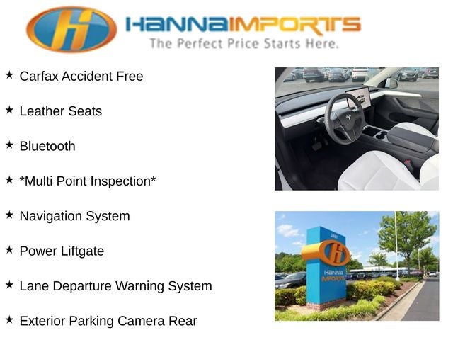 Why shop with Hanna Imports? We specialize in hand-selecting top-quality used cars, trucks, and SUVs for drivers across Raleigh, Durham, Cary, Chapel Hill, and the greater Triangle area of North Carolina. Our massive selection of 1,000+ vehicles on our Raleigh lot is carefully curated to include the most sought-after models, all priced below market value. We believe in transparency and efficiency—our vehicles are aggressively priced from the start, which means no haggling, no hassle, and no wasted time. The price you see is our absolute best price. Whether you're coming from Wake Forest, Apex, Garner, or anywhere in central NC, we’re committed to making your car-buying experience smooth, affordable, and enjoyable. Come see why Hanna Imports is one of the most trusted used car dealerships in North Carolina! Used Tesla Model Y in Raleigh. Used Tesla Model Y in North Carolina, Model Y Long Range, AWD, Exterior Parking Camera Rear, Lane Departure Warning System, Navigation System, Power Liftgate, Wheels: 19 x 9.5 Gemini Dark, 14 Speakers, 4-Wheel Disc Brakes, 5 Seat Interior, 9.0 Axle Ratio, ABS brakes, Air Conditioning, Alloy wheels, Audio memory, Auto High-beam Headlights, Auto tilt-away steering wheel, Auto-dimming door mirrors, Auto-dimming Rear-View mirror, Automatic temperature control, Brake assist, Bumpers: body-color, Compass, Delay-off headlights, Driver door bin, Driver vanity mirror, Dual front impact airbags, Dual front side impact airbags, Electronic Stability Control, Emergency communication system, Four wheel independent suspension, Front anti-roll bar, Front Bucket Seats, Front Center Armrest, Front dual zone A/C, Front fog lights, Front reading lights, Fully automatic headlights, Genuine wood dashboard insert, Heated door mirrors, Heated front seats, Heated rear seats, Heated steering wheel, HVAC memory, Illuminated entry, Knee airbag, Low tire pressure warning, Memory seat, Occupant sensing airbag, Outside temperature display, Overhead airbag, Passenger door bin, Passenger vanity mirror, Power door mirrors, Power driver seat, Power passenger seat, Power steering, Power windows, Radio data system, Radio: Premium Audio System w/13 Speakers, Rain sensing wipers, Rear reading lights, Rear seat center armrest, Rear window defroster, Security system, Speed control, Speed-sensing steering, Split folding rear seat, Steering wheel memory, Steering wheel mounted A/C controls, Steering wheel mounted audio controls, Telescoping steering wheel, Tilt steering wheel, Traction control, Trip computer, Variably intermittent wipers, and Vegan Leather Seat Trim.