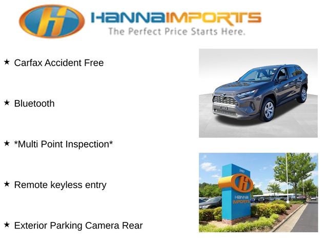 Why shop with Hanna Imports? We specialize in hand-selecting top-quality used cars, trucks, and SUVs for drivers across Raleigh, Durham, Cary, Chapel Hill, and the greater Triangle area of North Carolina. Our massive selection of 1,000+ vehicles on our Raleigh lot is carefully curated to include the most sought-after models, all priced below market value. We believe in transparency and efficiency—our vehicles are aggressively priced from the start, which means no haggling, no hassle, and no wasted time. The price you see is our absolute best price. Whether you're coming from Wake Forest, Apex, Garner, or anywhere in central NC, we’re committed to making your car-buying experience smooth, affordable, and enjoyable. Come see why Hanna Imports is one of the most trusted used car dealerships in North Carolina! Used Toyota RAV4 in Raleigh. Used Toyota RAV4 in North Carolina, RAV4 LE, AWD, Black w/Fabric Seat Trim, Exterior Parking Camera Rear, Remote keyless entry, 17 Steel Wheels, 4-Wheel Disc Brakes, 6 Speakers, ABS brakes, Air Conditioning, AM/FM radio: SiriusXM, Auto High-beam Headlights, Axle Ratio: 3.177, Brake assist, Bumpers: body-color, Driver door bin, Driver vanity mirror, Dual front impact airbags, Dual front side impact airbags, Electronic Stability Control, Emergency communication system: Safety Connect (10-year trial), Fabric Seat Trim, Four wheel independent suspension, Front anti-roll bar, Front Bucket Seats, Front Center Armrest, Front reading lights, Illuminated entry, Knee airbag, Low tire pressure warning, Occupant sensing airbag, Outside temperature display, Overhead airbag, Overhead console, Panic alarm, Passenger door bin, Passenger vanity mirror, Power door mirrors, Power steering, Power windows, Radio data system, Radio: AM/FM/XM Audio System, Rear anti-roll bar, Rear seat center armrest, Rear window defroster, Rear window wiper, Speed control, Speed-sensing steering, Split folding rear seat, Spoiler, Steering wheel mounted audio controls, Tachometer, Telescoping steering wheel, Tilt steering wheel, Traction control, and Trip computer.