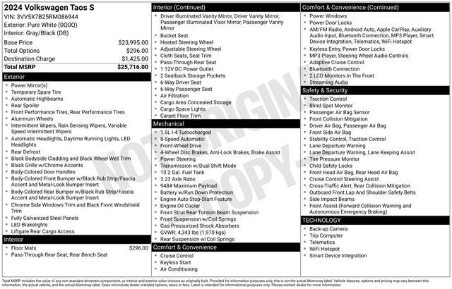 2024 Volkswagen Taos 1.5T S Pure White 28/36 City/Highway MPG