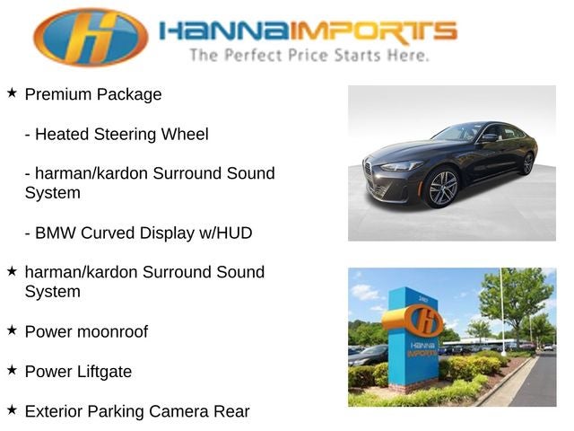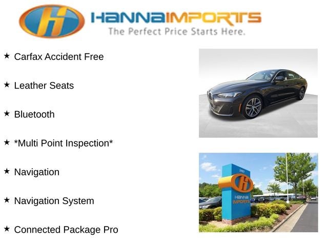 Why shop with Hanna Imports? We specialize in hand-selecting top-quality used cars, trucks, and SUVs for drivers across Raleigh, Durham, Cary, Chapel Hill, and the greater Triangle area of North Carolina. Our massive selection of 1,000+ vehicles on our Raleigh lot is carefully curated to include the most sought-after models, all priced below market value. We believe in transparency and efficiency—our vehicles are aggressively priced from the start, which means no haggling, no hassle, and no wasted time. The price you see is our absolute best price. Whether you're coming from Wake Forest, Apex, Garner, or anywhere in central NC, we’re committed to making your car-buying experience smooth, affordable, and enjoyable. Come see why Hanna Imports is one of the most trusted used car dealerships in North Carolina! Used BMW 4 Series in Raleigh. Used BMW 4 Series in North Carolina, Connected Package Pro, Premium Package (BMW Curved Display w/HUD, harman/kardon Surround Sound System, and Heated Steering Wheel), 430i Gran Coupe, Apple CarPlay & Android Auto Compatibility, Exterior Parking Camera Rear, Navigation, Navigation System, Power Liftgate, Power moonroof, 10 Speakers, 4-Wheel Disc Brakes, ABS brakes, Air Conditioning, Alloy wheels, AM/FM radio: SiriusXM, Audio memory, Auto High-beam Headlights, Auto-dimming door mirrors, Auto-dimming Rear-View mirror, Automatic temperature control, BMW Assist eCall, BMW TeleServices, Brake assist, Bumpers: body-color, Compass, ConnectedDrive Services, Delay-off headlights, Driver door bin, Driver vanity mirror, Dual front impact airbags, Dual front side impact airbags, Electronic Stability Control, Emergency communication system: BMW Assist eCall, Four wheel independent suspension, Front anti-roll bar, Front Bucket Seats, Front Center Armrest, Front dual zone A/C, Front reading lights, Fully automatic headlights, Garage door transmitter, Genuine wood console insert, Genuine wood dashboard insert, Heated door mirrors, Heated Front Seats, Heated front seats, Hi-Fi Sound System, HVAC memory, Illuminated entry, Knee airbag, Leather steering wheel, Low tire pressure warning, Lumbar Support, Memory seat, Occupant sensing airbag, Outside temperature display, Overhead airbag, Overhead console, Panic alarm, Passenger door bin, Passenger vanity mirror, Perforated Sensatec Upholstery, Personal eSIM 5G, Power door mirrors, Power driver seat, Power Front Seats, Power passenger seat, Power steering, Power windows, Radio data system, Radio: AM/FM Audio System, Rain sensing wipers, Rear anti-roll bar, Rear reading lights, Rear seat center armrest, Rear window defroster, Remote keyless entry, Security system, SiriusXM Satellite Radio w/1-Year Subscription, Speed control, Speed-sensing steering, Speed-Sensitive Wipers, Split folding rear seat, Sport Seats, Sport steering wheel, Steering wheel mounted audio controls, Tachometer, Telescoping steering wheel, Tilt steering wheel, Traction control, Trip computer, Turn signal indicator mirrors, Variably intermittent wipers, Wheels: 18 x 8.5 Dual-Spoke Bicolor, Widescreen Display, and Wireless Device Charging.