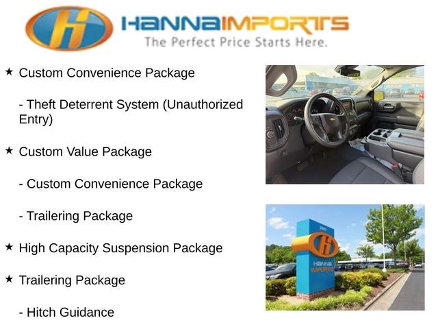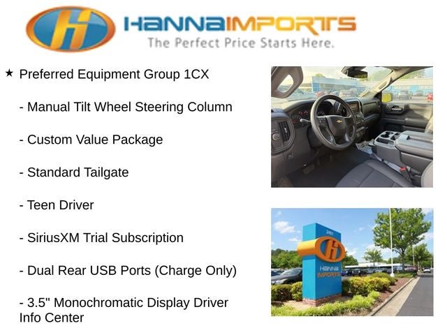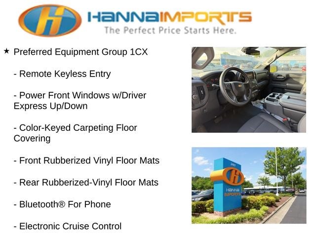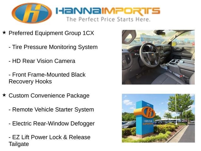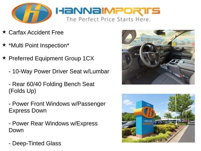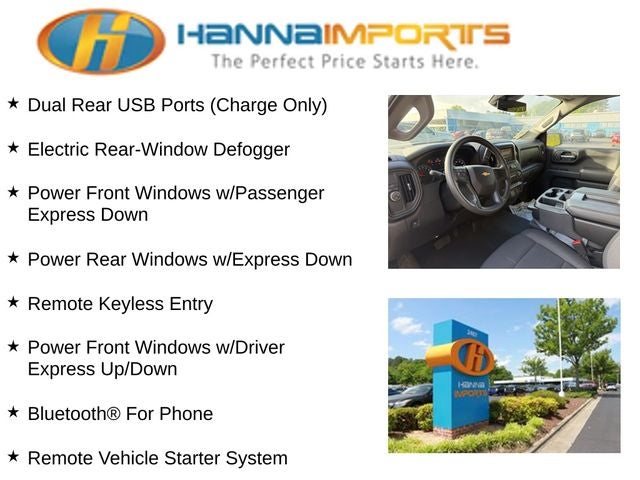Why shop with Hanna Imports? We specialize in hand-selecting top-quality used cars, trucks, and SUVs for drivers across Raleigh, Durham, Cary, Chapel Hill, and the greater Triangle area of North Carolina. Our massive selection of 1,000+ vehicles on our Raleigh lot is carefully curated to include the most sought-after models, all priced below market value. We believe in transparency and efficiency—our vehicles are aggressively priced from the start, which means no haggling, no hassle, and no wasted time. The price you see is our absolute best price. Whether you're coming from Wake Forest, Apex, Garner, or anywhere in central NC, we’re committed to making your car-buying experience smooth, affordable, and enjoyable. Come see why Hanna Imports is one of the most trusted used car dealerships in North Carolina! Used Chevrolet Silverado 1500 in Raleigh. Used Chevrolet Silverado 1500 in North Carolina, Custom Convenience Package (Electric Rear-Window Defogger, EZ Lift Power Lock & Release Tailgate, LED Cargo Area Lighting, Remote Vehicle Starter System, and Theft Deterrent System (Unauthorized Entry)), Custom Value Package, High Capacity Suspension Package, Preferred Equipment Group 1CX (10-Way Power Driver Seat w/Lumbar, 120-Volt Interior Power Outlet, 3.5 Monochromatic Display Driver Info Center, Bluetooth® For Phone, Color-Keyed Carpeting Floor Covering, Deep-Tinted Glass, Dual Rear USB Ports (Charge Only), Electronic Cruise Control, Front Frame-Mounted Black Recovery Hooks, Front Rubberized Vinyl Floor Mats, HD Rear Vision Camera, Manual Tilt Wheel Steering Column, OnStar Services Capable, Power Front Windows w/Driver Express Up/Down, Power Front Windows w/Passenger Express Down, Power Rear Windows w/Express Down, Rear 60/40 Folding Bench Seat (Folds Up), Rear Rubberized-Vinyl Floor Mats, Remote Keyless Entry, SiriusXM Trial Subscription, Standard Tailgate, Teen Driver, Tire Pressure Monitoring System, 120-Volt Bed Mounted Power Outlet, and Wi-Fi Hot Spot Capable), Trailering Package (Hitch Guidance), 2.7L I4 Turbocharged DOHC 16V LEV3-SULEV30 310hp, 8-Speed Automatic, Summit White, Black Cloth, 3.42 Rear Axle Ratio, 4-Wheel Disc Brakes, 40/20/40 Front Split-Bench Seat, 6 Speakers, 6-Speaker Audio System, ABS brakes, Air Conditioning, Alloy wheels, AM/FM radio: SiriusXM, Apple CarPlay/Android Auto, Auto High-beam Headlights, Automatic Emergency Braking, Brake assist, Bumpers: body-color, Cloth Seat Trim, Compass, Delay-off headlights, Driver door bin, Driver vanity mirror, Dual front impact airbags, Dual front side impact airbags, Electronic Stability Control, Emergency communication system: OnStar, Following Distance Indicat