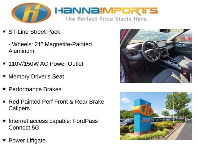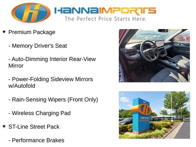Why shop with Hanna Imports? We specialize in hand-selecting top-quality used cars, trucks, and SUVs for drivers across Raleigh, Durham, Cary, Chapel Hill, and the greater Triangle area of North Carolina. Our massive selection of 1,000+ vehicles on our Raleigh lot is carefully curated to include the most sought-after models, all priced below market value. We believe in transparency and efficiency—our vehicles are aggressively priced from the start, which means no haggling, no hassle, and no wasted time. The price you see is our absolute best price. Whether you're coming from Wake Forest, Apex, Garner, or anywhere in central NC, we’re committed to making your car-buying experience smooth, affordable, and enjoyable. Come see why Hanna Imports is one of the most trusted used car dealerships in North Carolina! Used Ford Explorer in Raleigh. Used Ford Explorer in North Carolina, Equipment Group 300A Standard Package, Premium Package (110V/150W AC Power Outlet, 2nd Row Heated Seats, Ambient Lighting, Auto-Dimming Interior Rear-View Mirror, Memory Driver's Seat, Power-Folding Sideview Mirrors w/Autofold, Rain-Sensing Wipers (Front Only), and Wireless Charging Pad), ST-Line Street Pack (Performance Brakes, Red Painted Perf Front & Rear Brake Calipers, and Wheels: 21 Magnetite-Painted Aluminum), Explorer ST-Line, Exterior Parking Camera Rear, Internet access capable: FordPass Connect 5G, Navigation System, Power Liftgate, 10 Speakers, 2nd Row Captain's Chairs w/E-Z Entry & Armrest, 3.58 Non-Limited Slip Rear Axle, 3rd row seats: bench, 4-Wheel Disc Brakes, ABS brakes, Air Conditioning, Alloy wheels, AM/FM radio: SiriusXM with 360L, Apple CarPlay/Android Auto, Auto High-beam Headlights, Automatic temperature control, Brake assist, Bumpers: body-color, Compass, Delay-off headlights, Driver door bin, Driver vanity mirror, Dual front impact airbags, Dual front side impact airbags, Electronic Stability Control, Emergency communication system: 911 Assist, Four wheel independent suspension, Front anti-roll bar, Front Bucket Seats, Front Center Armrest, Front dual zone A/C, Front fog lights, Front License Plate Bracket, Front reading lights, Fully automatic headlights, Garage door transmitter, Heated door mirrors, Heated front seats, Heated steering wheel, Heated Unique Cloth Captain's Chairs, Illuminated entry, Knee airbag, Leather steering wheel, Low tire pressure warning, Occupant sensing airbag, Outside temperature display, Overhead airbag, Overhead console, Panic alarm, Passenger door bin, Passenger vanity mirror, Power door mirrors, Power driver seat, Power passenger seat, Power steering, Power windows, Radio: B&O Sound System by Bang & Olufsen, Rear air conditioning, Rear anti-roll bar, Rear reading lights, Rear window defroster, Rear window wiper, Remote keyless entry, Security system, Speed control, Speed-sensing steering, Speed-Sensitive Wipers, Split folding rear seat, Spoiler, Steering wheel mounted audio controls, Tachometer, Telescoping steering wheel, Tilt steering wheel, Traction control, Trip computer, Variably intermittent wipers, and Wheels: 20 Ebony-Painted Machined Aluminum.