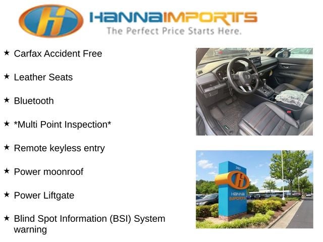 Why shop with Hanna Imports? We specialize in hand-selecting top-quality used cars, trucks, and SUVs for drivers across Raleigh, Durham, Cary, Chapel Hill, and the greater Triangle area of North Carolina. Our massive selection of 1,000+ vehicles on our Raleigh lot is carefully curated to include the most sought-after models, all priced below market value. We believe in transparency and efficiency—our vehicles are aggressively priced from the start, which means no haggling, no hassle, and no wasted time. The price you see is our absolute best price. Whether you're coming from Wake Forest, Apex, Garner, or anywhere in central NC, we’re committed to making your car-buying experience smooth, affordable, and enjoyable. Come see why Hanna Imports is one of the most trusted used car dealerships in North Carolina! Used Honda CR-V Hybrid in Raleigh. Used Honda CR-V Hybrid in North Carolina, CR-V Hybrid Sport-L, 2.0L I4 DOHC 16V, Blind Spot Information (BSI) System warning, Exterior Parking Camera Rear, Heated Front Bucket Seats, Leather Seat Trim, Power Liftgate, Power moonroof, Remote keyless entry, 4-Wheel Disc Brakes, 8 Speakers, ABS brakes, Adaptive Cruise Control: Adaptive Cruise Control (ACC) with Low-Speed Follow, Air Conditioning, Alloy wheels, AM/FM radio: SiriusXM, Auto High-beam Headlights, Auto-dimming Rear-View mirror, Automatic temperature control, Brake assist, Bumpers: body-color, Compass, Delay-off headlights, Driver door bin, Driver vanity mirror, Dual front impact airbags, Dual front side impact airbags, Electronic Stability Control, Four wheel independent suspension, Front anti-roll bar, Front Bucket Seats, Front Center Armrest, Front dual zone A/C, Front reading lights, Fully automatic headlights, Heated door mirrors, Heated front seats, Illuminated entry, Knee airbag, Leather Shift Knob, Leather steering wheel, Low tire pressure warning, Memory seat, Occupant sensing airbag, Outside temperature display, Overhead airbag, Overhead console, Panic alarm, Passenger door bin, Passenger vanity mirror, Power door mirrors, Power driver seat, Power passenger seat, Power steering, Power windows, Radio data system, Radio: 320-Watt AM/FM/HD/SiriusXM Audio System, Rear anti-roll bar, Rear reading lights, Rear seat center armrest, Rear side impact airbag, Rear window defroster, Rear window wiper, Security system, Speed control, Speed-sensing steering, Speed-Sensitive Wipers, Split folding rear seat, Spoiler, Steering wheel mounted audio controls, Telescoping steering wheel, Tilt steering wheel, Traction control, Trip computer, Turn signal indicator mirrors, Variably intermittent wipers, and Wheels: 18 Berlina Black Alloy.