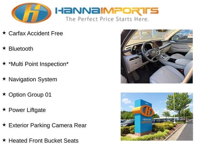 Why shop with Hanna Imports? We specialize in hand-selecting top-quality used cars, trucks, and SUVs for drivers across Raleigh, Durham, Cary, Chapel Hill, and the greater Triangle area of North Carolina. Our massive selection of 1,000+ vehicles on our Raleigh lot is carefully curated to include the most sought-after models, all priced below market value. We believe in transparency and efficiency—our vehicles are aggressively priced from the start, which means no haggling, no hassle, and no wasted time. The price you see is our absolute best price. Whether you're coming from Wake Forest, Apex, Garner, or anywhere in central NC, we’re committed to making your car-buying experience smooth, affordable, and enjoyable. Come see why Hanna Imports is one of the most trusted used car dealerships in North Carolina! Used Hyundai Palisade in Raleigh. Used Hyundai Palisade in North Carolina, Option Group 01, Palisade SEL, 3rd row seats: split-bench, Exterior Parking Camera Rear, Heated Front Bucket Seats, Navigation System, Power Liftgate, 4-Wheel Disc Brakes, 6 Speakers, ABS brakes, Air Conditioning, Alloy wheels, AM/FM radio: SiriusXM, Apple CarPlay & Android Auto, Auto High-beam Headlights, Auto-dimming Rear-View mirror, Automatic temperature control, Brake assist, Bumpers: body-color, Delay-off headlights, Driver door bin, Driver vanity mirror, Dual front impact airbags, Dual front side impact airbags, Electronic Stability Control, Emergency communication system, Four wheel independent suspension, Front anti-roll bar, Front Bucket Seats, Front Center Armrest, Front dual zone A/C, Front reading lights, Fully automatic headlights, H-Tex Leatherette Seat Trim, Heated door mirrors, Heated front seats, Illuminated entry, Knee airbag, Leather steering wheel, Low tire pressure warning, Occupant sensing airbag, Outside temperature display, Overhead airbag, Overhead console, Panic alarm, Passenger door bin, Passenger vanity mirror, Power door mirrors, Power driver seat, Power passenger seat, Power steering, Power windows, Radio data system, Radio: AM/FM/MP3 Audio System, Rear air conditioning, Rear anti-roll bar, Rear audio controls, Rear reading lights, Rear side impact airbag, Rear window defroster, Rear window wiper, Reclining 3rd row seat, Remote keyless entry, Security system, Speed control, Speed-sensing steering, Split folding rear seat, Spoiler, Steering wheel mounted audio controls, Tachometer, Telescoping steering wheel, Tilt steering wheel, Traction control, Trip computer, Turn signal indicator mirrors, Variably intermittent wipers, and Wheels: 18 x 7.5J Painted Finish Alloy.
