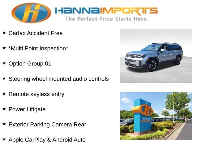 Why shop with Hanna Imports? We specialize in hand-selecting top-quality used cars, trucks, and SUVs for drivers across Raleigh, Durham, Cary, Chapel Hill, and the greater Triangle area of North Carolina. Our massive selection of 1,000+ vehicles on our Raleigh lot is carefully curated to include the most sought-after models, all priced below market value. We believe in transparency and efficiency—our vehicles are aggressively priced from the start, which means no haggling, no hassle, and no wasted time. The price you see is our absolute best price. Whether you're coming from Wake Forest, Apex, Garner, or anywhere in central NC, we’re committed to making your car-buying experience smooth, affordable, and enjoyable. Come see why Hanna Imports is one of the most trusted used car dealerships in North Carolina! Used Hyundai Santa Fe in Raleigh. Used Hyundai Santa Fe in North Carolina, Option Group 01, Santa Fe SEL, Gray Premium Synthetic, 3rd row seats: bench, Apple CarPlay & Android Auto, Exterior Parking Camera Rear, Heated Front Bucket Seats, Power Liftgate, Remote keyless entry, Steering wheel mounted audio controls, 18 x 7.5J Alloy Wheels, 4-Wheel Disc Brakes, 6 Speakers, ABS brakes, Air Conditioning, Alloy wheels, AM/FM radio: SiriusXM, Auto High-beam Headlights, Automatic temperature control, Brake assist, Bumpers: body-color, Delay-off headlights, Driver door bin, Driver vanity mirror, Dual front impact airbags, Dual front side impact airbags, Electronic Stability Control, Emergency communication system, Four wheel independent suspension, Front anti-roll bar, Front Bucket Seats, Front Center Armrest, Front dual zone A/C, Front reading lights, Fully automatic headlights, H-Tex Leatherette Seat Trim, Heated door mirrors, Heated front seats, Illuminated entry, Knee airbag, Leather steering wheel, Low tire pressure warning, Occupant sensing airbag, Outside temperature display, Overhead airbag, Overhead console, Panic alarm, Passenger door bin, Passenger vanity mirror, Power door mirrors, Power driver seat, Power steering, Power windows, Radio: AM/FM/HD Display Audio, Rear anti-roll bar, Rear seat center armrest, Rear side impact airbag, Rear window defroster, Rear window wiper, Security system, Speed control, Speed-sensing steering, Split folding rear seat, Spoiler, Tachometer, Telescoping steering wheel, Tilt steering wheel, Traction control, Trip computer, Turn signal indicator mirrors, and Variably intermittent wipers.