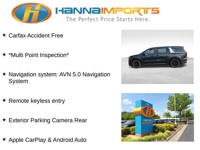 Why shop with Hanna Imports? We specialize in hand-selecting top-quality used cars, trucks, and SUVs for drivers across Raleigh, Durham, Cary, Chapel Hill, and the greater Triangle area of North Carolina. Our massive selection of 1,000+ vehicles on our Raleigh lot is carefully curated to include the most sought-after models, all priced below market value. We believe in transparency and efficiency—our vehicles are aggressively priced from the start, which means no haggling, no hassle, and no wasted time. The price you see is our absolute best price. Whether you're coming from Wake Forest, Apex, Garner, or anywhere in central NC, we’re committed to making your car-buying experience smooth, affordable, and enjoyable. Come see why Hanna Imports is one of the most trusted used car dealerships in North Carolina! Used Kia Carnival in Raleigh. Used Kia Carnival in North Carolina, Carnival LXS, Apple CarPlay & Android Auto, Exterior Parking Camera Rear, Navigation system: AVN 5.0 Navigation System, Remote keyless entry, 3.51 Axle Ratio, 3rd row seats: split-bench, 4-Wheel Disc Brakes, 6 Speakers, 6.5J x 17 Alloy Wheels, ABS brakes, Air Conditioning, Alloy wheels, AM/FM radio: SiriusXM, Auto High-beam Headlights, Automatic temperature control, Brake assist, Bumpers: body-color, Compass, Delay-off headlights, Driver door bin, Driver vanity mirror, Dual front impact airbags, Dual front side impact airbags, Electronic Stability Control, Emergency communication system, Four wheel independent suspension, Front anti-roll bar, Front Bucket Seats, Front Center Armrest, Front dual zone A/C, Front reading lights, Fully automatic headlights, Heated door mirrors, Illuminated entry, Knee airbag, Low tire pressure warning, Occupant sensing airbag, Outside temperature display, Overhead airbag, Overhead console, Panic alarm, Passenger door bin, Passenger vanity mirror, Power door mirrors, Power steering, Power windows, Radio: AM/FM/HD Audio System, Rear air conditioning, Rear anti-roll bar, Rear reading lights, Rear window defroster, Rear window wiper, Reclining 3rd row seat, Security system, Speed control, Speed-sensing steering, Split folding rear seat, Spoiler, Steering wheel mounted audio controls, Tachometer, Telescoping steering wheel, Tilt steering wheel, Traction control, Trailer Prewire Harness, Trip computer, Turn signal indicator mirrors, and Variably intermittent wipers.