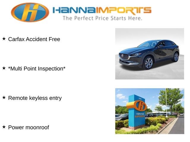 Why shop with Hanna Imports? We specialize in hand-selecting top-quality used cars, trucks, and SUVs for drivers across Raleigh, Durham, Cary, Chapel Hill, and the greater Triangle area of North Carolina. Our massive selection of 1,000+ vehicles on our Raleigh lot is carefully curated to include the most sought-after models, all priced below market value. We believe in transparency and efficiency—our vehicles are aggressively priced from the start, which means no haggling, no hassle, and no wasted time. The price you see is our absolute best price. Whether you're coming from Wake Forest, Apex, Garner, or anywhere in central NC, we’re committed to making your car-buying experience smooth, affordable, and enjoyable. Come see why Hanna Imports is one of the most trusted used car dealerships in North Carolina! Used Mazda CX-30 in Raleigh. Used Mazda CX-30 in North Carolina, CX-30 2.5 S Preferred Package, AWD, Power moonroof, Remote keyless entry, 4-Wheel Disc Brakes, 6 Speakers, ABS brakes, Air Conditioning, Alloy wheels, AM/FM radio, AppLink/Apple CarPlay and Android Auto, Auto High-beam Headlights, Automatic temperature control, Brake assist, Bumpers: body-color, Compass, Delay-off headlights, Driver door bin, Driver vanity mirror, Dual front impact airbags, Dual front side impact airbags, Electronic Stability Control, Emergency communication system: Mazda Connected Services (3-year trial subscription included), Exterior Parking Camera Rear, Front anti-roll bar, Front Bucket Seats, Front Center Armrest, Front dual zone A/C, Front reading lights, Front wheel independent suspension, Fully automatic headlights, Heated door mirrors, Heated Front Bucket Seats, Heated front seats, High Wall All-Weather Floor Mats, Illuminated entry, Knee airbag, Leather Shift Knob, Leather steering wheel, Leatherette Seat Trim, Low tire pressure warning, MAZDA CONNECT Infotainment System, Memory seat, Occupant sensing airbag, Outside temperature display, Overhead airbag, Overhead console, Panic alarm, Passenger door bin, Passenger vanity mirror, Power door mirrors, Power driver seat, Power steering, Power windows, Radio data system, Radio: AM/FM Audio System, Rain sensing wipers, Rear seat center armrest, Rear side impact airbag, Rear window defroster, Rear window wiper, Speed control, Speed-sensing steering, Split folding rear seat, Spoiler, Steering wheel mounted audio controls, Tachometer, Telescoping steering wheel, Tilt steering wheel, Traction control, Trip computer, Turn signal indicator mirrors, Variably intermittent wipers, and Wheels: 18 x 7J Aluminum Alloy.