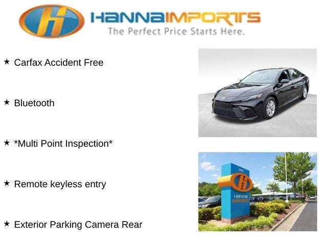 Why shop with Hanna Imports? We specialize in hand-selecting top-quality used cars, trucks, and SUVs for drivers across Raleigh, Durham, Cary, Chapel Hill, and the greater Triangle area of North Carolina. Our massive selection of 1,000+ vehicles on our Raleigh lot is carefully curated to include the most sought-after models, all priced below market value. We believe in transparency and efficiency—our vehicles are aggressively priced from the start, which means no haggling, no hassle, and no wasted time. The price you see is our absolute best price. Whether you're coming from Wake Forest, Apex, Garner, or anywhere in central NC, we’re committed to making your car-buying experience smooth, affordable, and enjoyable. Come see why Hanna Imports is one of the most trusted used car dealerships in North Carolina! Used Toyota Camry in Raleigh. Used Toyota Camry in North Carolina, Camry LE, 2.5L 4-Cylinder 16V DOHC, Black w/Fabric Seat Trim, Exterior Parking Camera Rear, Remote keyless entry, 4-Wheel Disc Brakes, 6 Speakers, ABS brakes, Air Conditioning, Alloy wheels, AM/FM radio: SiriusXM, Apple CarPlay/Android Auto, Auto High-beam Headlights, Automatic temperature control, Brake assist, Bumpers: body-color, Delay-off headlights, Driver door bin, Driver vanity mirror, Dual front impact airbags, Dual front side impact airbags, Electronic Stability Control, Emergency communication system: Safety Connect (up to 10-year trial subscription), Fabric Seat Trim, Four wheel independent suspension, Front anti-roll bar, Front Bucket Seats, Front Center Armrest, Front dual zone A/C, Front reading lights, Fully automatic headlights, Heated door mirrors, Illuminated entry, Knee airbag, Low tire pressure warning, Occupant sensing airbag, Outside temperature display, Overhead airbag, Overhead console, Panic alarm, Passenger door bin, Passenger vanity mirror, Power door mirrors, Power steering, Power windows, Radio data system, Radio: Toyota Audio Multimedia w/8 Touchscreen, Rear anti-roll bar, Rear seat center armrest, Rear side impact airbag, Rear window defroster, Security system, Speed control, Speed-sensing steering, Split folding rear seat, Steering wheel mounted audio controls, Telescoping steering wheel, Tilt steering wheel, Traction control, Trip computer, Turn signal indicator mirrors, Variably intermittent wipers, and Wheels: 16 Silver-Finished Alloy.